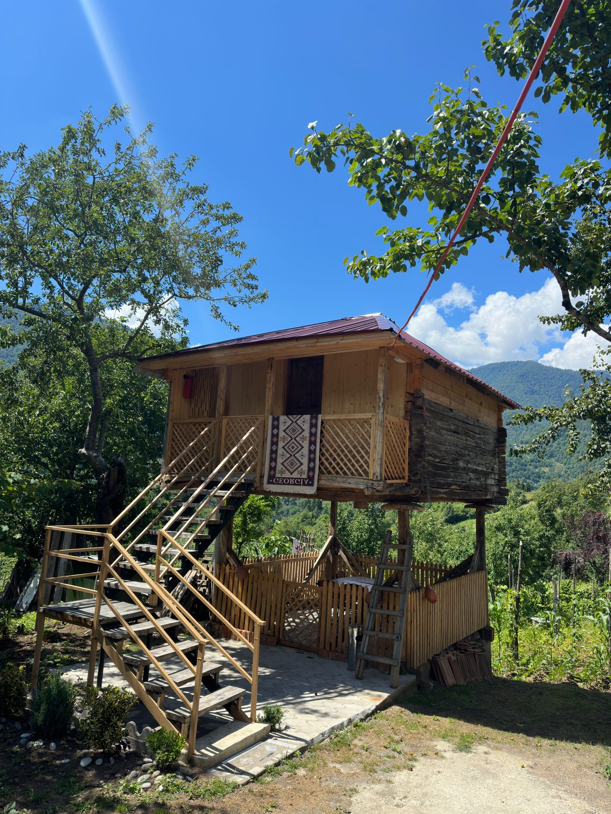 Discover unique living in a wooden cottage in tranquil rural Georgia. It is located in the middle of an orchard on the property of the guest house. This is for those who appreciate quiet, clean relaxation and a return to a simple and basic lifestyle. The house is environmentally friendly and only natural products, local materials and recycled raw materials are used. House in the middle of an orchard. 26 sqm with its own terrace and garden. We prepare breakfasts upon prior request.