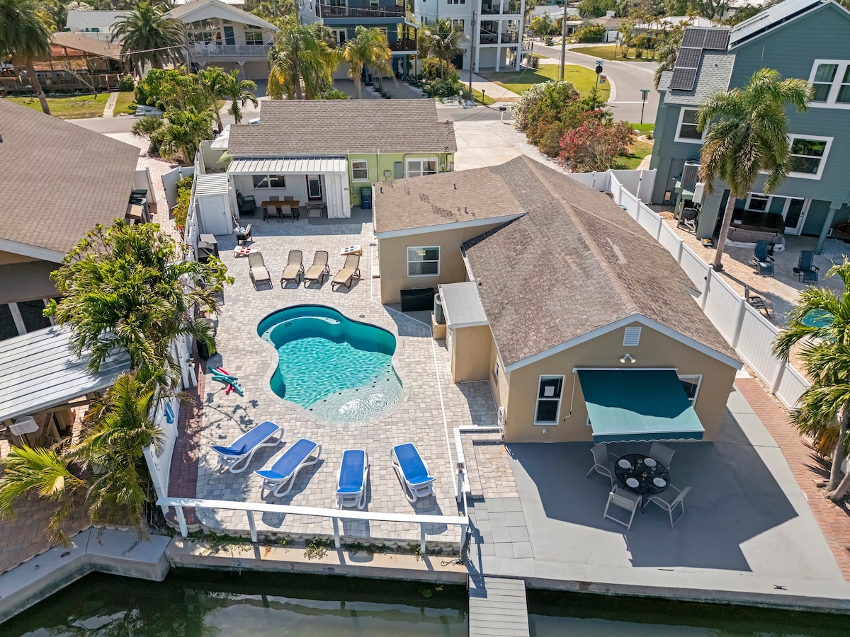 SHOW STOPPER best describes your absolutely gorgeous remodeled 4 bedroom 2 full baths FREE HEATED POOL home. We do not charge extra to heat the pool. We are 5 min to gulf beaches! Your home has everything you need for your relaxing vacation.We are a 5 min drive to the closest beach. Wonderful pool, TIKI BAR, pool area market lights and fire pit in the backyard! Wonderful open concept ! Safe and quiet neighborhood . Home is at the end of a cul de sac. FAST WIFI 802 mbps verified by Airbnb