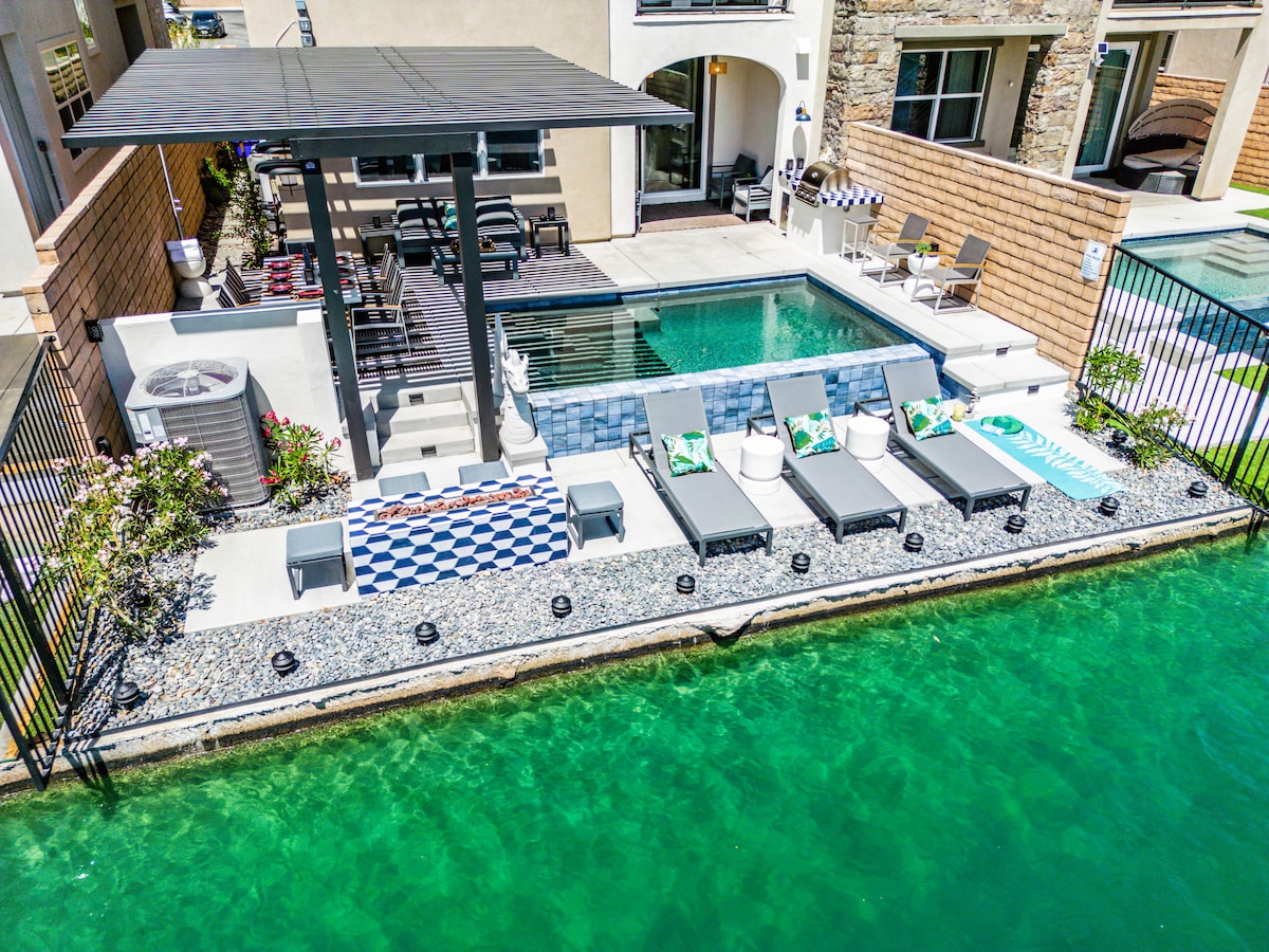 We welcome you to relax and enjoy a one-of-a-kind stunning backyard, a private LAZY RIVER POOL in the desert! Resort-style living. Huge pool, Caribbean clearwater with a full round of Lazy River. THE BEST POOL IN THE DESERT! Hot tub, Rainfall bridge, 'Tornado' Waterslide, Relaxing in-pool loungers for tanning lovers, Pool basketball, Pool floats, River tubes, Outdoor Bluetooth speakers, BBQ Grill, and luxurious relaxing outdoor seating and dining areas.