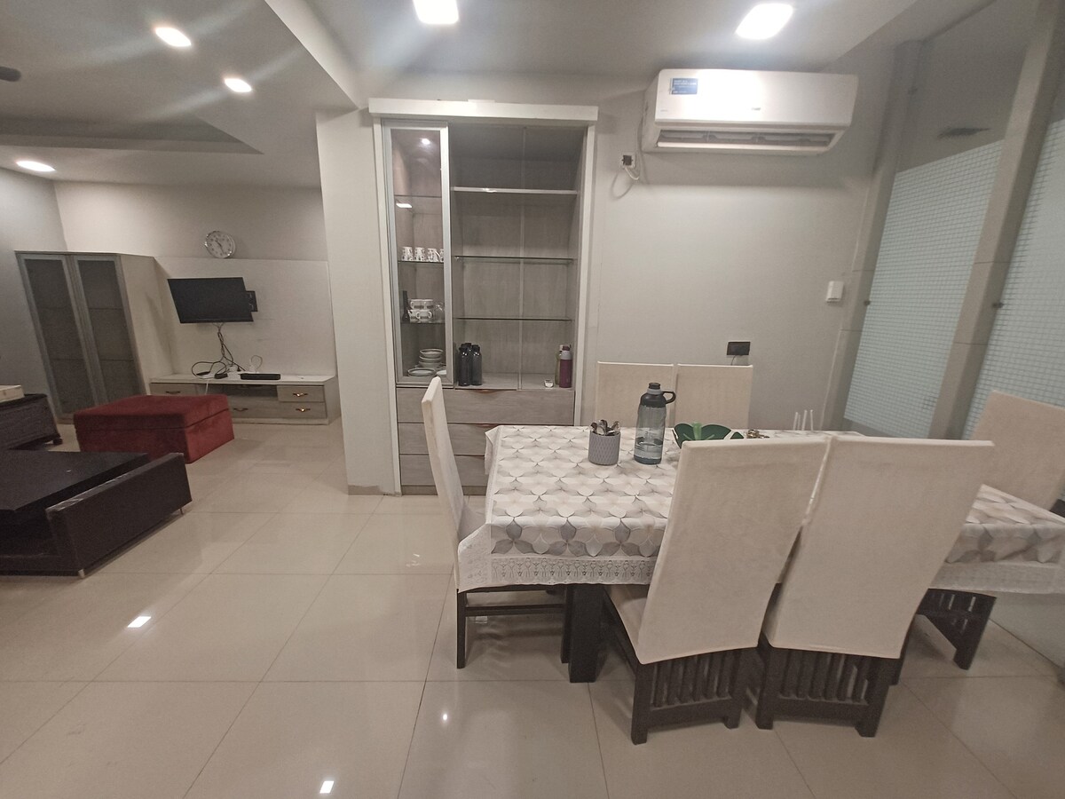 Forget your worries in this spacious 3000 sqft and serene space home,has a bright and modern feel, with polished tile floors and white walls throughout.A living area with a dark brownsofa, a dining area with a table and chairs, and a kitchen featuring white and dark cabinets. The bedrooms have large wardrobes, and there's also a balcony with a view of the surroundings. NOTE: PLEASE AVOID LOUD NOISE/MUSIC/ DANCE/ PARTYING as this flat is a part of society and Please strictly follow societyrules