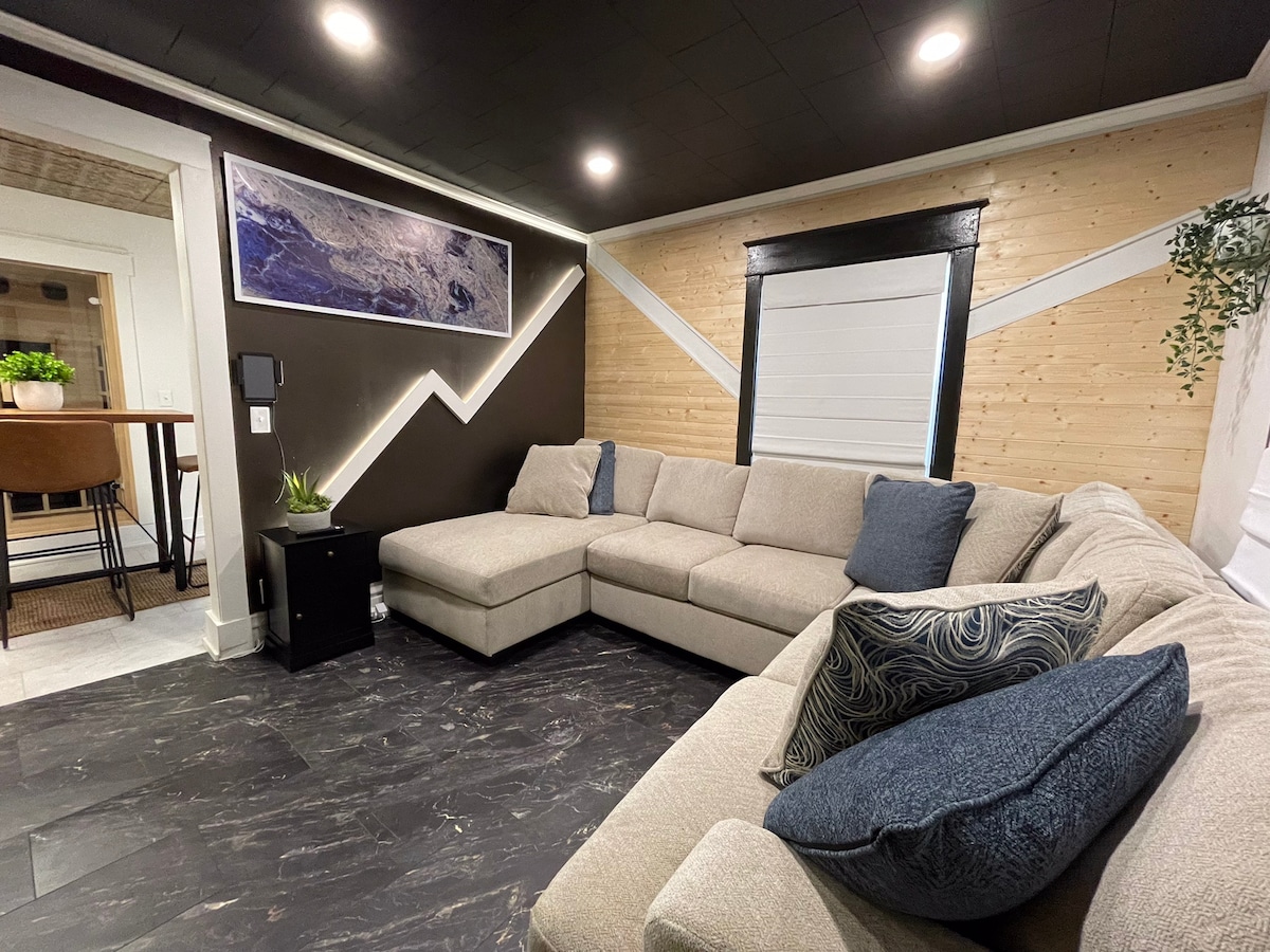 Welcome home. For our fourth experience, Kendall and I wanted to keep pushing two things : unique + cozy. Lights that can set a vibe with the push of a button. Check Gas fire inside, bonfire out. Check Custom epoxy dining table. Check Samsung The Frame TV. Check Light strip on the wall that would make Luke Skywalker jealous. Check And the chefs kiss? A massive hot tub that we probably splurged a hair heavy on. But what we call an investment, you will call the best part of your trip.