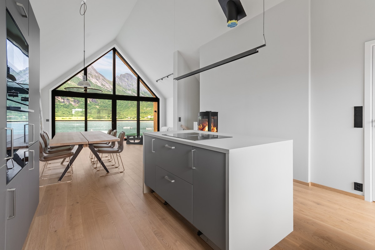 位於海邊的現代小屋,可欣賞美景。 在這裡,您可以找到完美的度假村,在那裡您可以放鬆身心,欣賞海景和雄偉的山脈,並可以在不離開小木屋的情況下自行釣晚餐。 很棒的釣魚和徒步旅行機會。 附近有24小時全天候商店和咖啡廳,著名的Kvitnes Gård餐廳僅8分鐘車程。