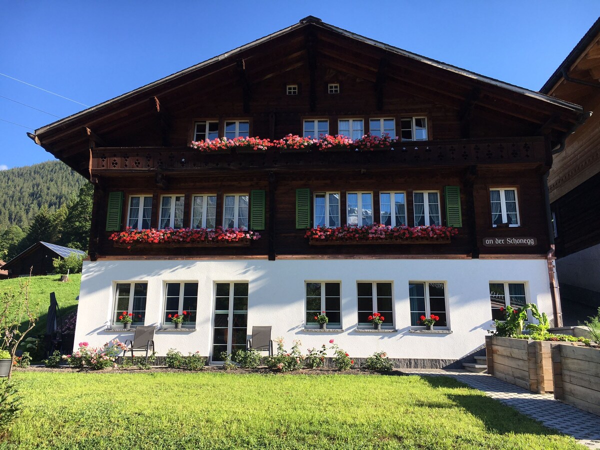 Unser Traditionelles Holz Chalet liegt am Südhang leicht erhöht über dem Brienzersee. Von der Ferienwohnung aus geniessen Sie einmalige, wunderschöne Aussicht über den grünblauen Brienzersee mit umliegenden Bergen! Die Wohnung liegt im Parterre und hat direkter Zugang zur Garten mit Terasse +See/Bergsicht Es sind 3Min zu Fuss zum Seeufer. GRATIS PARKPLATZ direkt neben dem Haus. Viele Sportliche-Ausflugsmöglichkeiten in der Nähe. Trampoline ist nur für unsere Gäste. *Sehr beliebt für Homeoffice*