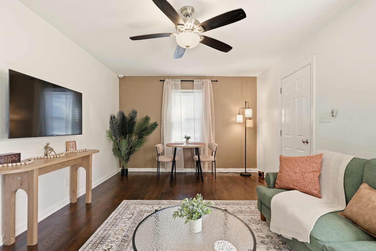 可愛的公寓,離什麼都很近!步行即可抵達商店、博物館、餐廳、咖啡廳、酒吧、Tanger Center、雜貨店、城市公園等。步行即可抵達UNC Greensboro、NC A&T和Elon Law。 客廳有 65 吋智慧電視。所有設備與服務,包括洗衣機、烘衣機、洗碗機和微波爐。提供咖啡、茶、過濾水和零食。所有寢具、毛巾和床單。 無論您喜歡夜生活、公園散步還是嘗試新餐廳,格林斯伯勒市中心都有!
