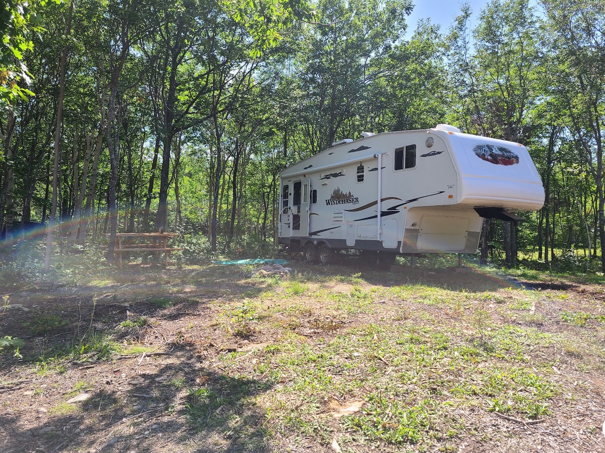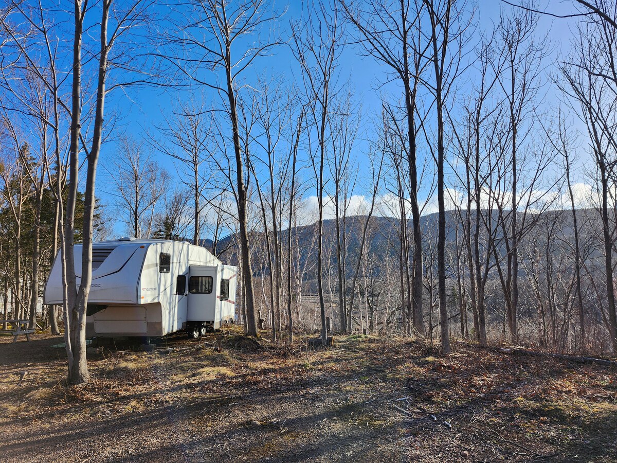 If you are looking for a camping experience but do not want to rough it, try our clean, well-kept, 33-foot RV. Trailer has a queen sized master bedroom and bunk beds in rear, livingroom, indoor and outdoor kitchen. Enjoy the evening roasting marshmallows at the firepit or take a stroll to the waterfalls which are 100m away. Travel 20mins to Grand Narrows/Iona to enjoy a day at the beach. Located in central Cape Breton within 1 hour drive of golfing, museums, site seeing, restaurants and more.