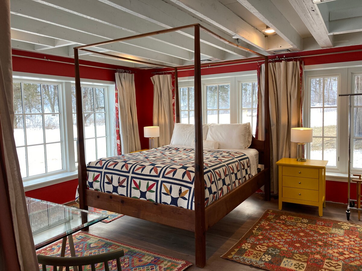 時髦、整潔的23年鄉村小木屋,位於120英畝的農田和樹林中,位於私密、安靜的鄉村環境中。 溫馨舒適, 950平方英尺,用石頭和木材建造。 開放式概念,配有兩層樓的壁爐、門廊壁爐、火坑和開放式閣樓( 1張牀) ,配有螺旋樓梯、許多窗戶、核桃地板和裝飾、橡木樑和鬆木廚房頂部。 淋浴間很大且開放,門通往後甲板,可供戶外淋浴。 美麗的有蓋門廊,可俯瞰滾動的草地和森林。