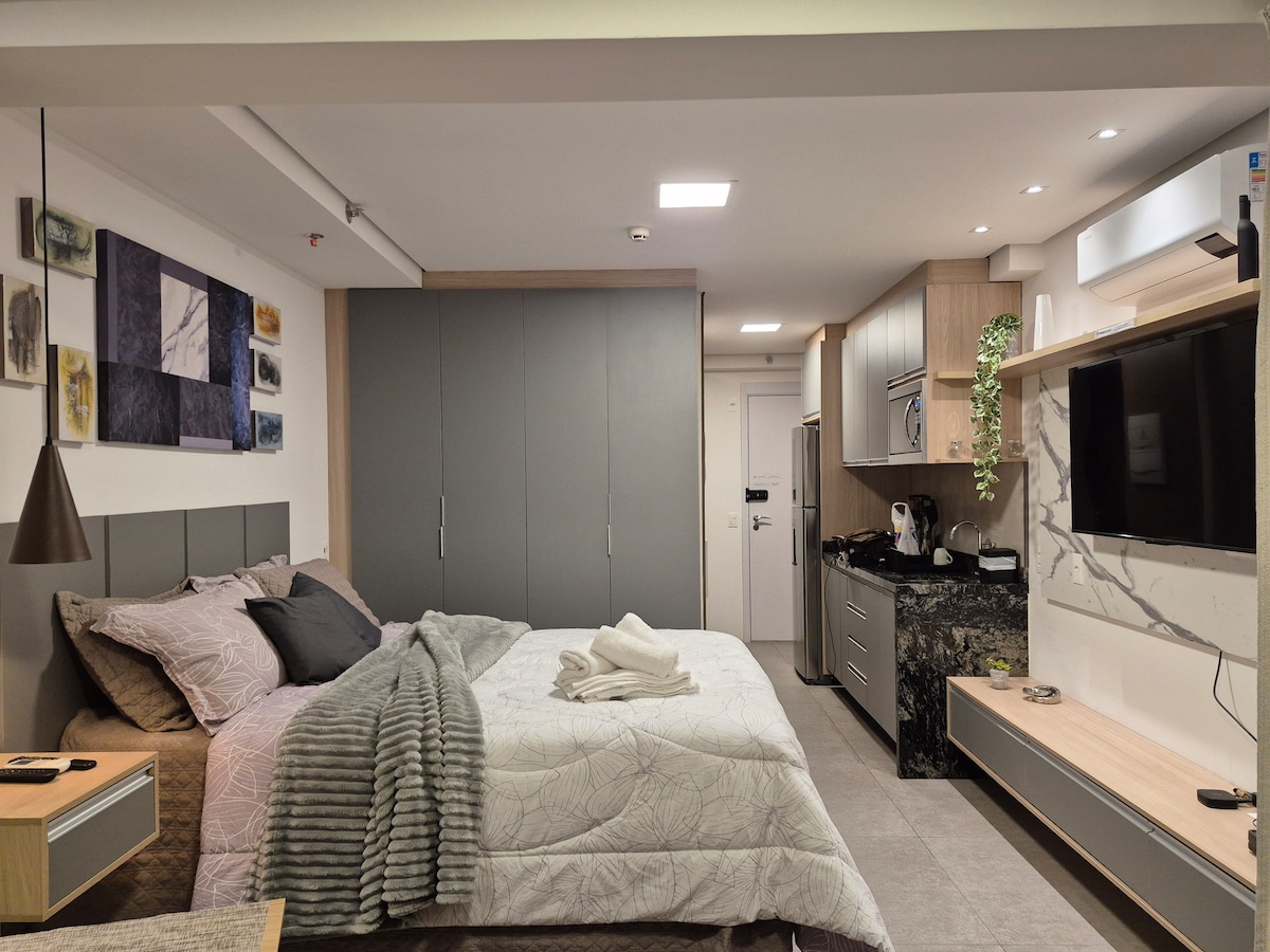 Refined environment, perfect for those seeking premium comfort in SP. Full kitchen: sandwich maker, microwave, cooktop, minibar, cold water filter and utensils. Modern decor, air conditioning, ultra-fast Wi-Fi and smart TV. Double bed and double futon sofa, cozy lighting and impeccable organization. Prime location: close to the subway, parks, restaurants, pharmacies and hospitals. Come enjoy São Paulo with style and comfort! 😃