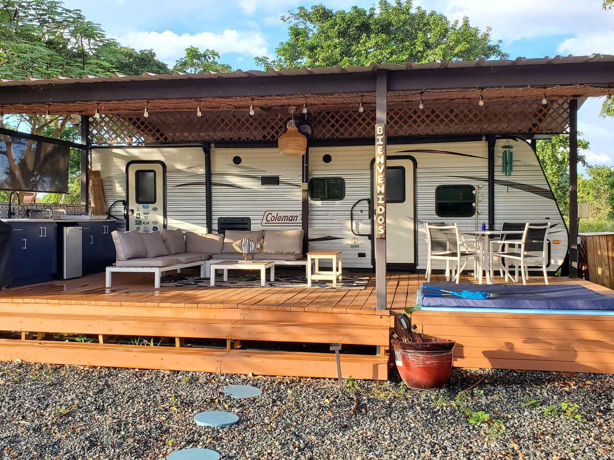 入住這間優質度假屋,重回大自然的懷抱。私人村莊,距離PR最好的海灘之一Jobos海灘3分鐘。可容納15人,最多19人,分佈在3輛豪華露營車中。美麗的後院,配有泳池、按摩浴缸、火坑、室外淋浴間、涼亭、室外廚房、排球-足球網和適合各年齡層的遊戲。 距離機場10分鐘路程,位於美食天堂的中心。 親朋好友享受海灘和大自然的完美地方。
