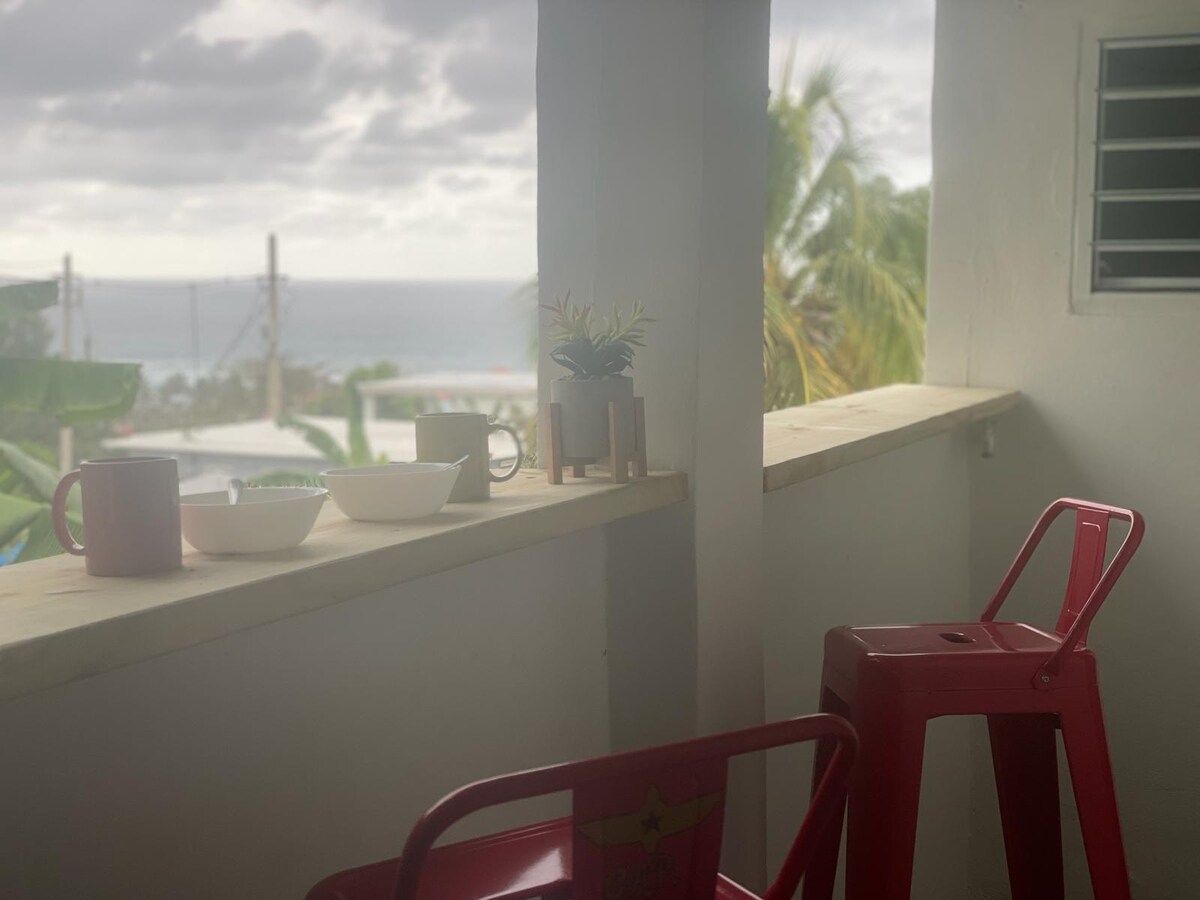 輕鬆簡單的島嶼氛圍,俯瞰大海。一邊喝咖啡或喝一杯葡萄酒,一邊看著鯨魚經過。 靠近廣場、海灘、雜貨店、餐廳、摩托車租賃等。靠近許多餐廳和景點,Middles海灘、Jobos、Surfer 's、Gozalandia、Crash Boat海灘等。420友好,歡迎所有人來到這個有景觀的小屋。女士們來參加您的女孩之旅,有很多空間供您舉辦活動,海灘度假。 僅限成人和青少年。