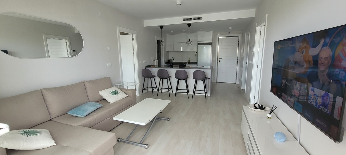Apartamento en primera línea de playa a estrenar. Vistas al mar. Moderno y funcional. Zona muy tranquila y familiar. Salida directa al paseo marítimo. Playas espectaculares. Dormitorio principal con vistas al mar. Dispone de dos habitaciones, una con cama grande y otra habitación con dos camas individuales. En el comedor existe un sofá cama de 1,40. Terraza con vistas al mar. Cocina americana completamente amueblada y con todo el menaje. Lavadero. Dispone de dos baños completos. WIFI Urbanización en primera línea de playa con piscina, pistas de padel, plaza de parking cubierta.