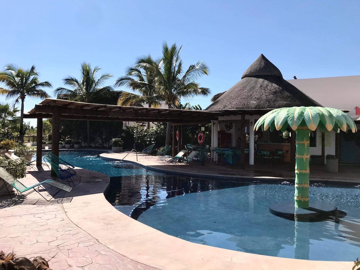 公寓距離海灘200公尺,步行5分鐘,您不需要您的車。 公寓位於一樓,配有: -Recamara Principal 配有雙人床 -次要臥室,配有雙層床 -1 浴室和 1/2 -設備齊全的廚房 -共用空間和飯廳 -客廳有智慧電視 -Wi-Fi -可俯瞰泳池景觀的陽台 -可欣賞海洋景觀的露臺 便利設備 -泳池 - 帶瓦斯烤架的Palapas -自行車 -健身區 -小型高爾夫球場 -遊戲兒童 -排球場 -受控存取權限