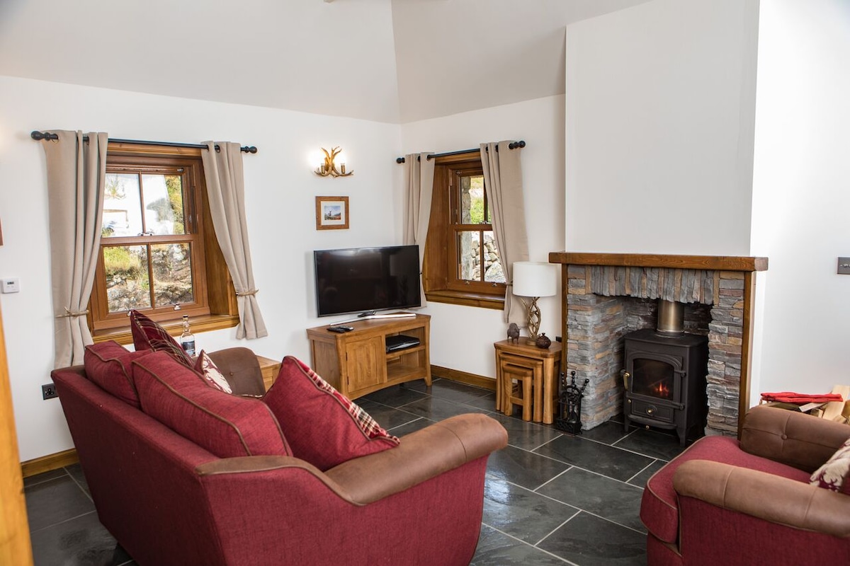 這間獨特的房源風格獨到。坐落在山頂上,可欣賞Sleat的迷人景致,欣賞Eigg和Rum群島的壯麗景色,以及蘇格蘭最西端的遠處。您可以坐在露臺上放鬆身心,也可以坐在火坑邊享受寧靜。享受您的放鬆休息,在室內享受地暖和木柴火的溫暖光芒。