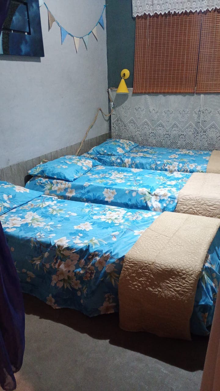 Suíte privativa no andar superior, nao é compartilhada, em razao disso, preferencia para grupos ou familia que ocupem todas as acomodações . Acomoda até cinco pessoas, tem tv ( Youtube e Netflix) ventilador no quarto, , banheiro amplo . Sao compartilhados, apenas, cozinha, sala de estar, área para nootbook, espaço para o chá, refeitório, churrasqueira e piscina. Obs: Não oferecemos serviços de quartos.