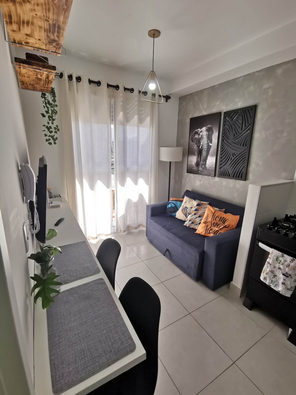 Este lugar único tem um estilo próprio. Todo o teto do apartamento com pintura que não é o branco. O sofá-cama com abertura "diferente". Cama Queen confortável com lençóis de qualidade. Pode-se assistir a Smart TV no quarto, sala, cozinha e varanda. Fica suspensa no teto com giro de 360°. Cozinha bem equipada e cooktop de 2 bocas de indução. Banheiro com barra de segurança e decoração clean. Varanda com mesa e espaço para home office. Ótimo isolamento acústico. Sol da manhã.