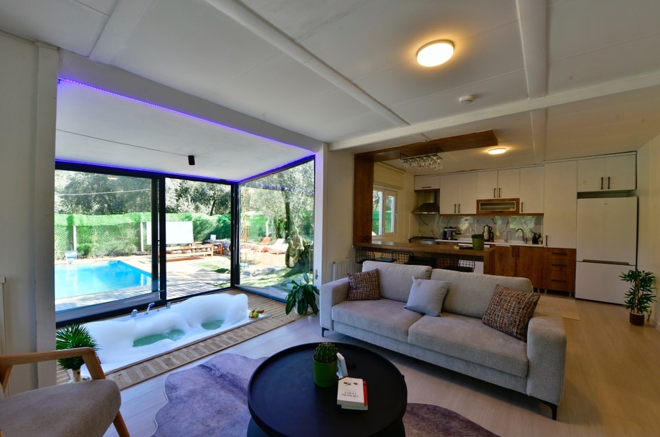 Tiny house evimizde 2 yetişkin 2 çocuk konaklayabilirsiniz. Açılabilir L koltuk ve loft katta bulunan yatak odası sayesinde çok rahat bir şekilde uykunuzu keyifli hale getirebilirsiniz Romantik size özel havuz ve bahçemizde günün her anının tadını çıkarabilirsiniz Şömine sobalı kış bahçesi mevcuttur (Yaz mevsiminde havuz ısıtma sistemi aktif değildir)