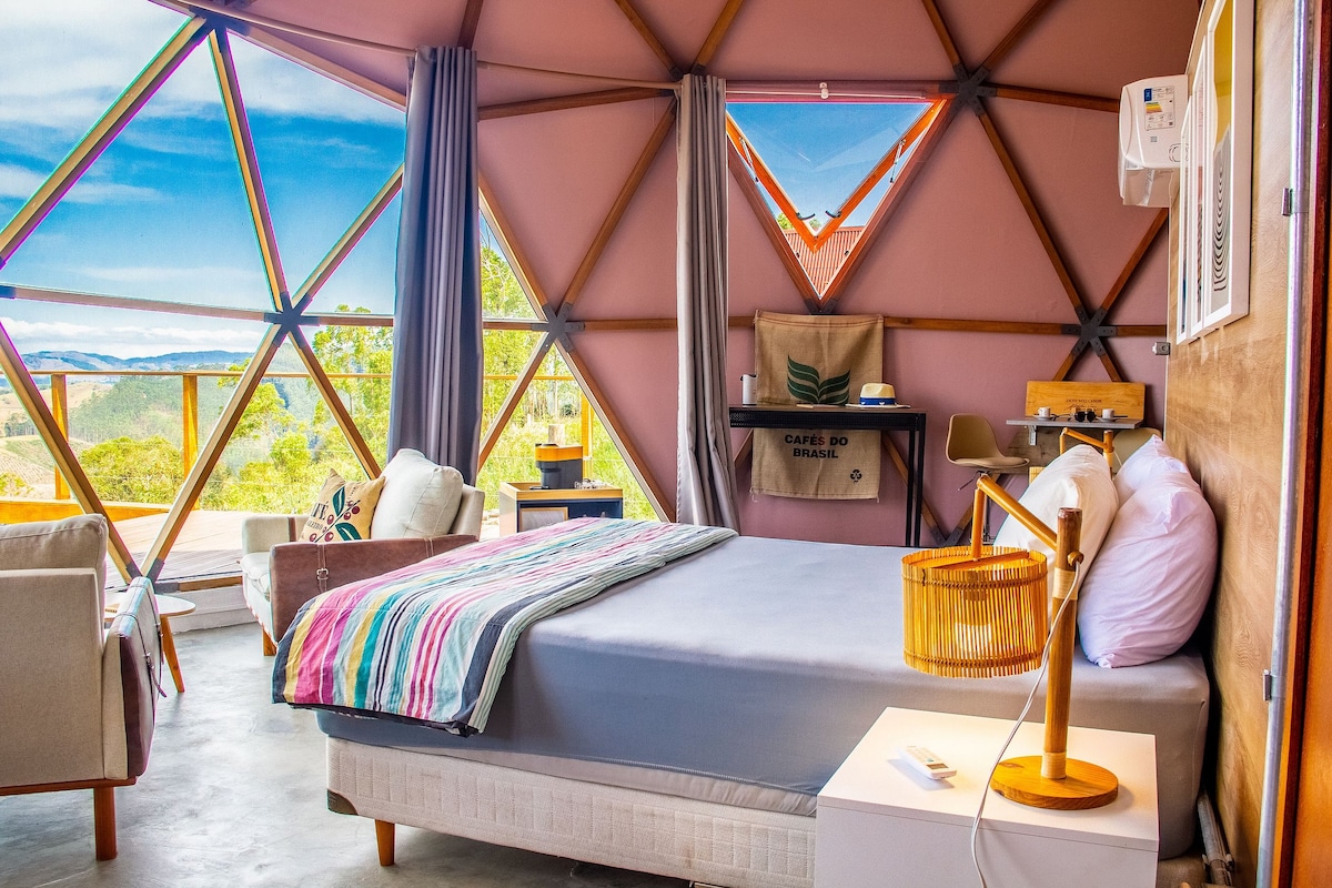 這是一棟在每個細節上都充滿藝術感的平房......浴缸的玻璃天花板面向森林,給人一種沉浸在大自然中的感覺,前面有一棵百年老樹,鳥兒飛舞......與大西洋森林保護區的大自然相連,給人一種親密而溫馨的感覺。另一個熱水淋浴間位於露天甲板上,白天或夜晚都可以欣賞星空和月光。