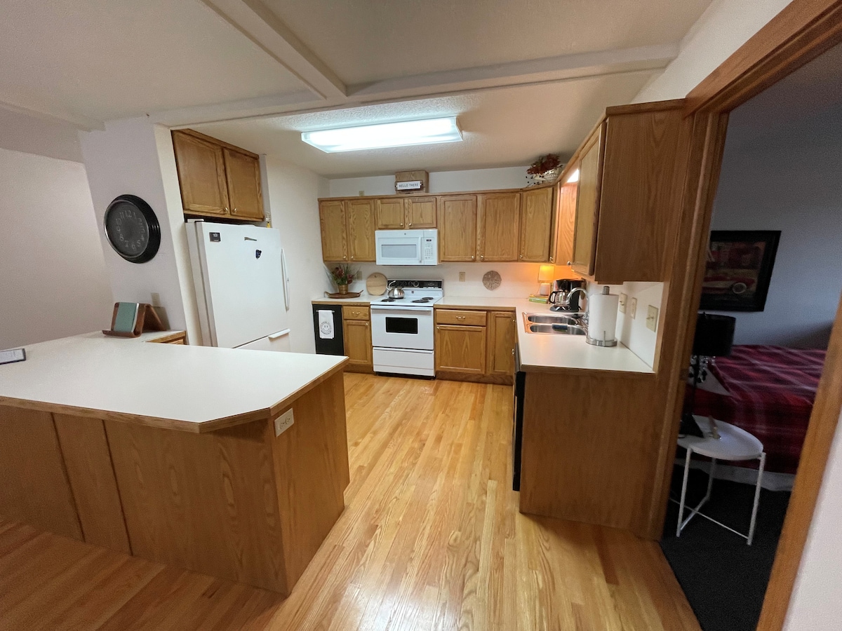 豪華1400平方英尺公寓。所有電器,包括洗衣機和烘乾機。快速網絡和有線電視。靠近飯店、雜貨店和Schells Brewery,步行即可抵達。街對面有鋪砌的自行車道。套房非常適合來新烏爾姆(New Ulm)的工作人員,需要非常舒適的短期或長期住宿。也非常適合週末放鬆身心。我們有時會彈性處理房客人數。如果超過3人,需要事先批准。第二張床是一個小房間的日式床墊。