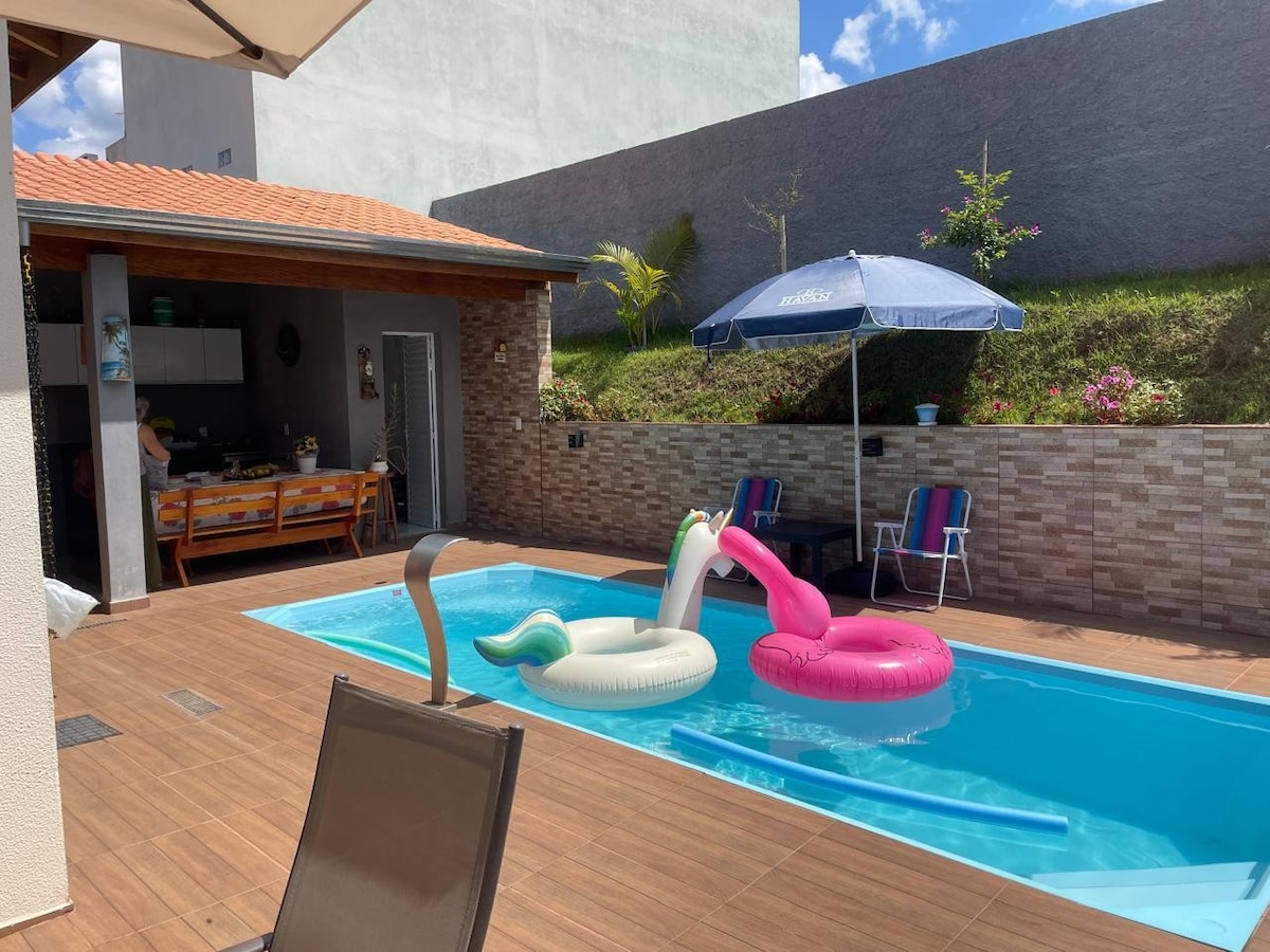 Casa térrea de 2 quartos, sala de estar, cozinha/edícula e lavanderia. Quintal amplo e arborizado,com piscina, mini-campo de futebol, quadra esportiva e garagem coberta. Piscina de alvenaria , com 8 metros de comprimento por 4 metros de largura, com profundidade variável e gradativa, começando em 80 cm até atingir 1,80 m. Há internet de fibra, com velocidade de 150mb, disponibilizada via conexão wi-fi.