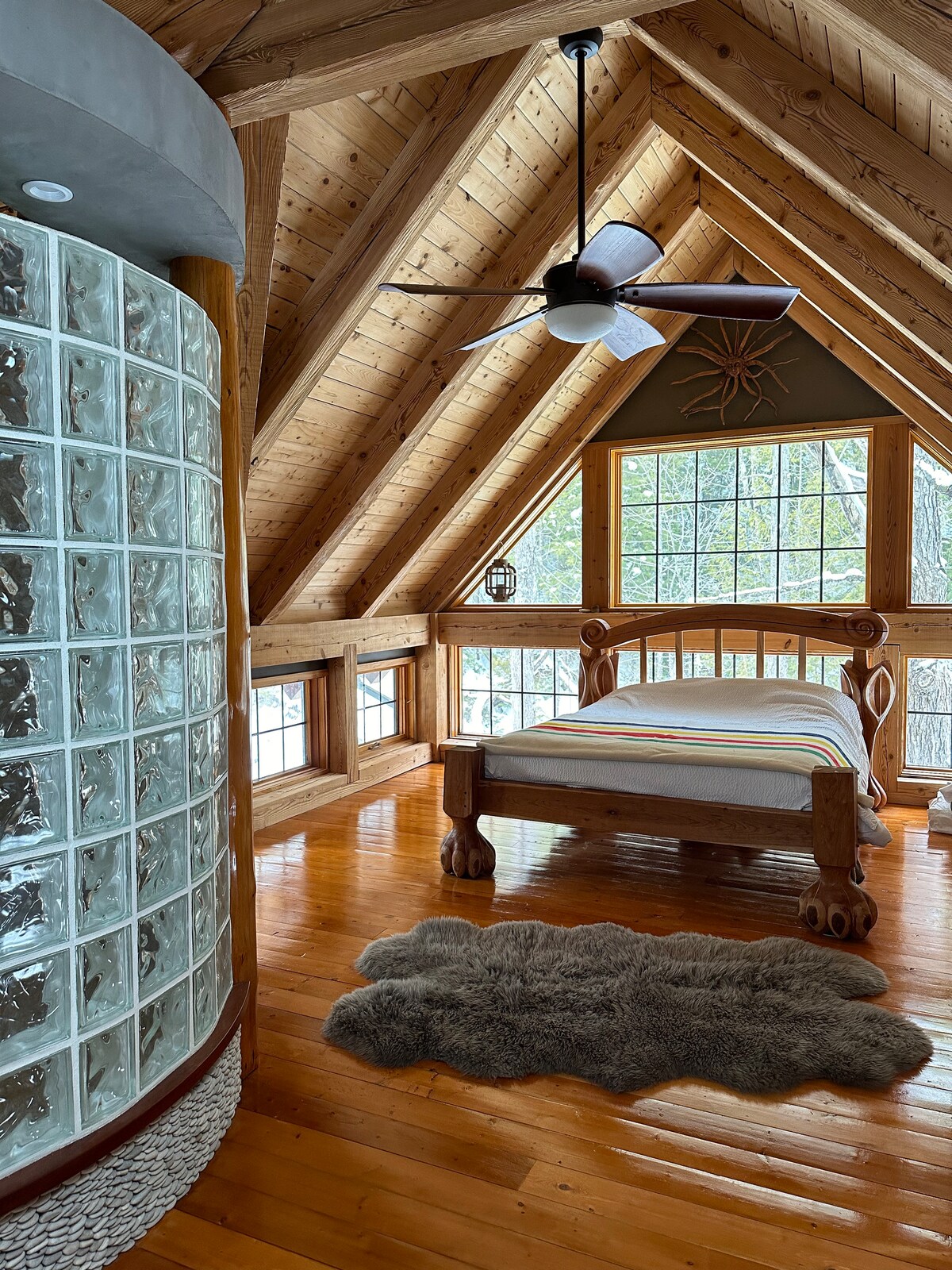 Nestled in two giant pine trees at the edge of a 20-acre pond, this true Vermont treehouse features a private cedar hot tub, fire pit, and canoe for exploring the water. Open year-round, it’s perfect for a cozy getaway, romantic retreat, or winter snow adventure, just 5 minutes from downtown Newport and 22 minutes to Jay Peak Ski Resort.