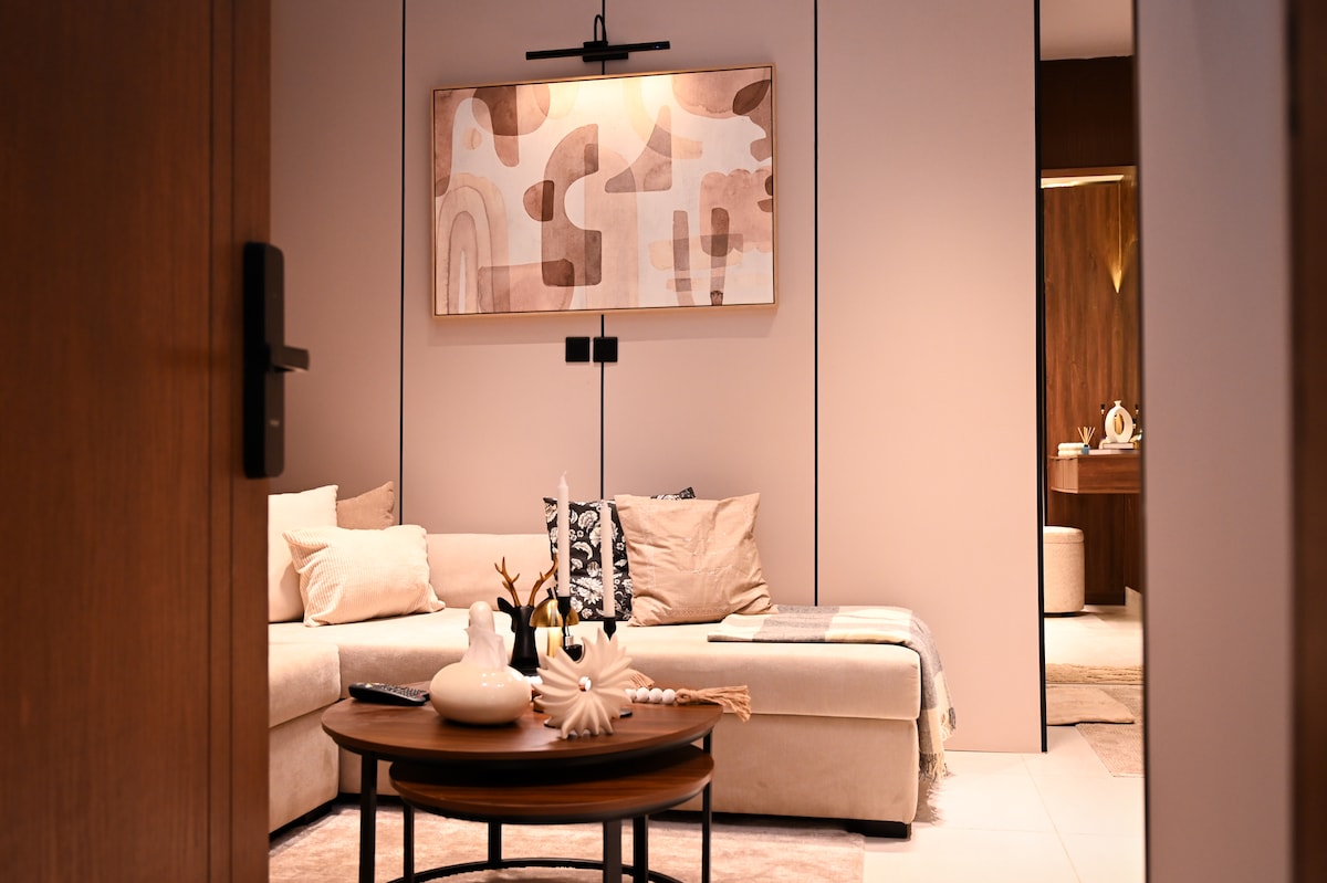 美麗的住宅。在Sondos 街區(綠洲)。獨特而安靜。面積 35 公尺。現代家具。音響系統。65 吋智慧螢幕。智能門禁。內部隔熱。整合式咖啡角。高潔淨度。飛利浦空氣淨化器。Aromatic 裝置。臥室窗戶自動遮光。位於塔利亞街的新住宅區(Sondos),靠近服務設施。10 分鐘到 Jasmine Mall、17 分鐘到機場、10 分鐘到 Haramain 鐵路、25 分鐘到 Corniche。