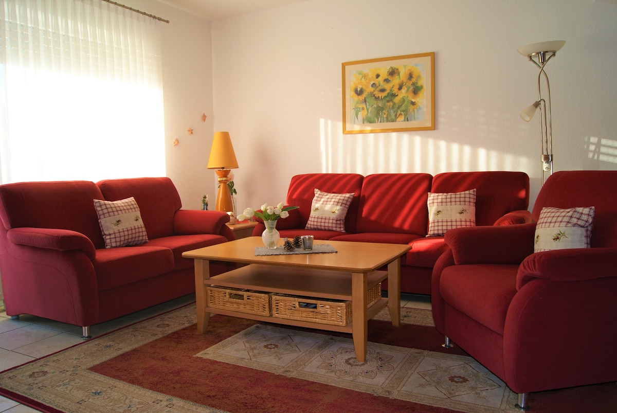 Die entspannte Atmosphäre des Gartens in Südlage macht die Wohnung zum perfekten Erholungsort für die ganze Familie und lädt zum gemütlichen Grillabend ein. Neben der Aussicht auf den eignen Garten bietet die in 2021 gebaute Ferienwohnung Übernachtungsmöglichkeiten für bis zu 4 Personen. Es gibt einen eigenen Parkplatz, Bettwäsche und WLAN. Für eure E-Bikes haben wir einen abschließbaren Geräteraum.Es handelt sich um eine Nichtraucherwohnung und auch Haustiere müssen leider zu Hause bleiben.