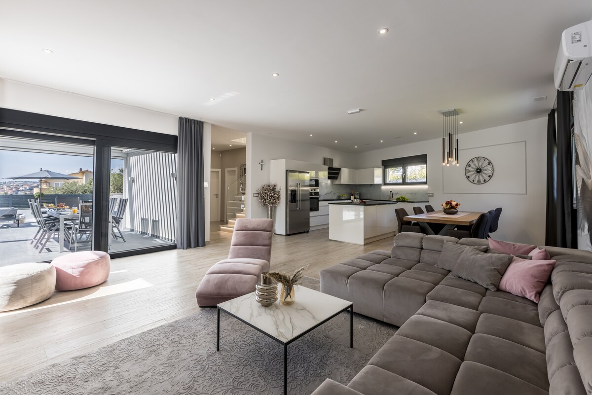 我們全新的豪華別墅Joy位於一個美妙的位置,景觀美麗,私密性最大,但仍然非常靠近所有當地景點。別墅新建,提供最大的舒適和奢華,配有4間套房臥室和您可能需要的所有其他設備。一個大型私人溫水泳池、6人按摩浴缸、紅外線桑拿房、私人電影院和遊戲室、撞球室、一個巨大的圍欄戶外區域,配有足球場、羽毛球場或乒乓球場。