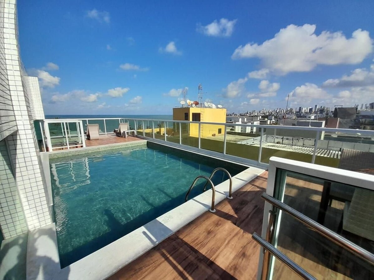 入住這間充滿風格和舒適的豪華公寓,與全家人一起用餐,配有優質的家具。 我們最多可舒適地容納3人。 在陽臺上,您可以在吊牀上放鬆身心,欣賞美麗的海景。 休閒區位於頂層公寓,配有泳池、健身房、美食空間、廣場和許多起居區域。 休假期間的會議和私人小木屋。 確認您的預訂,在João Pessoa度過美好的一天!