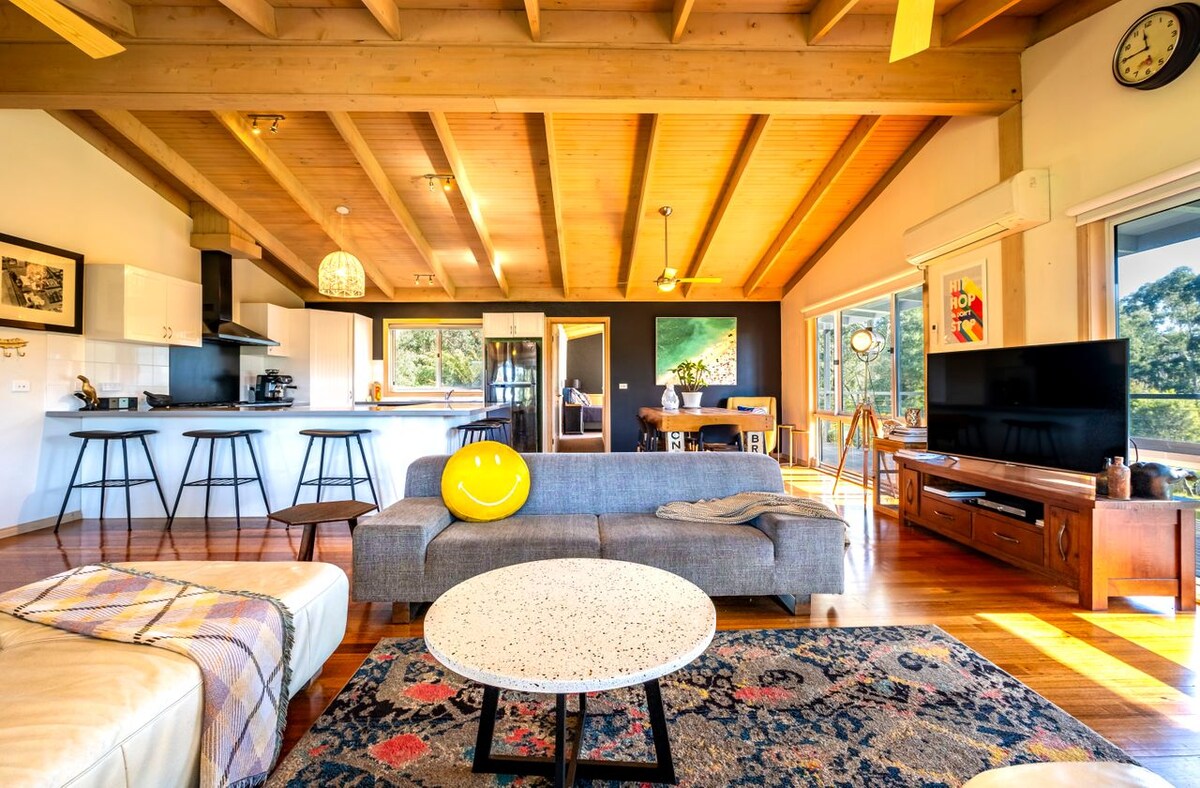Gone Surfin位於Lavers Hill和Yuulong之間的大洋路的最高點。 這裡是奧特威的中心,非常適合放鬆和探索該地區,但完全隔離在2.5英畝修繕好的草坪和花園中,可欣賞到巴斯海峽、約翰娜海灘和奧特威山脈的壯麗景色。 奧特威( Otway )是所有景點的中心,在大洋路( Great Ocean Road )上,但完全僻靜--這只是計劃您的假期時需要考慮的完美房源。