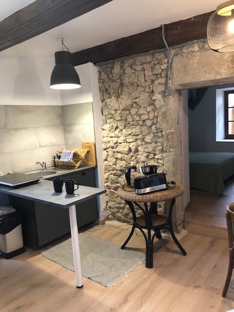 Gabrielle et Benjamin vous accueillent dans l'ancienne grange de leur maison qu'ils ont aménagé avec soins pour la transformer en un studio lumineux de 27 m2. La décoration est résolument contemporaine et colorée pour la pièce de vie et néo-rétro pour la salle de douche. Le coin cuisine/repas dispose de l'essentiel pour réchauffer ou cuisiner des mets simples. Situé dans le hameau de Ballon qui surplombe la ville, il vous offre calme et confort pour vos séjours de 2 nuits minimum.