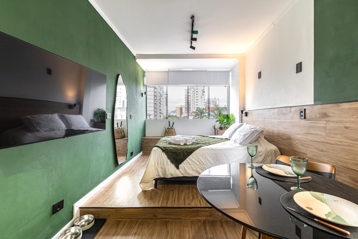 2611公寓,面積48平方公尺,讓房客可以在床上欣賞日落。公寓實用且超級舒適。此空間非常適合情侶和商務旅客入住,也可以容納第三位成人或最多兩名兒童。 非常適合有狗的房客(我們接受重量高達15公斤的中小型狗,需額外收取120.00雷亞爾的費用)。禁止貓入住。 這肯定會為您帶來難忘的時刻,在Santos最好的公寓!