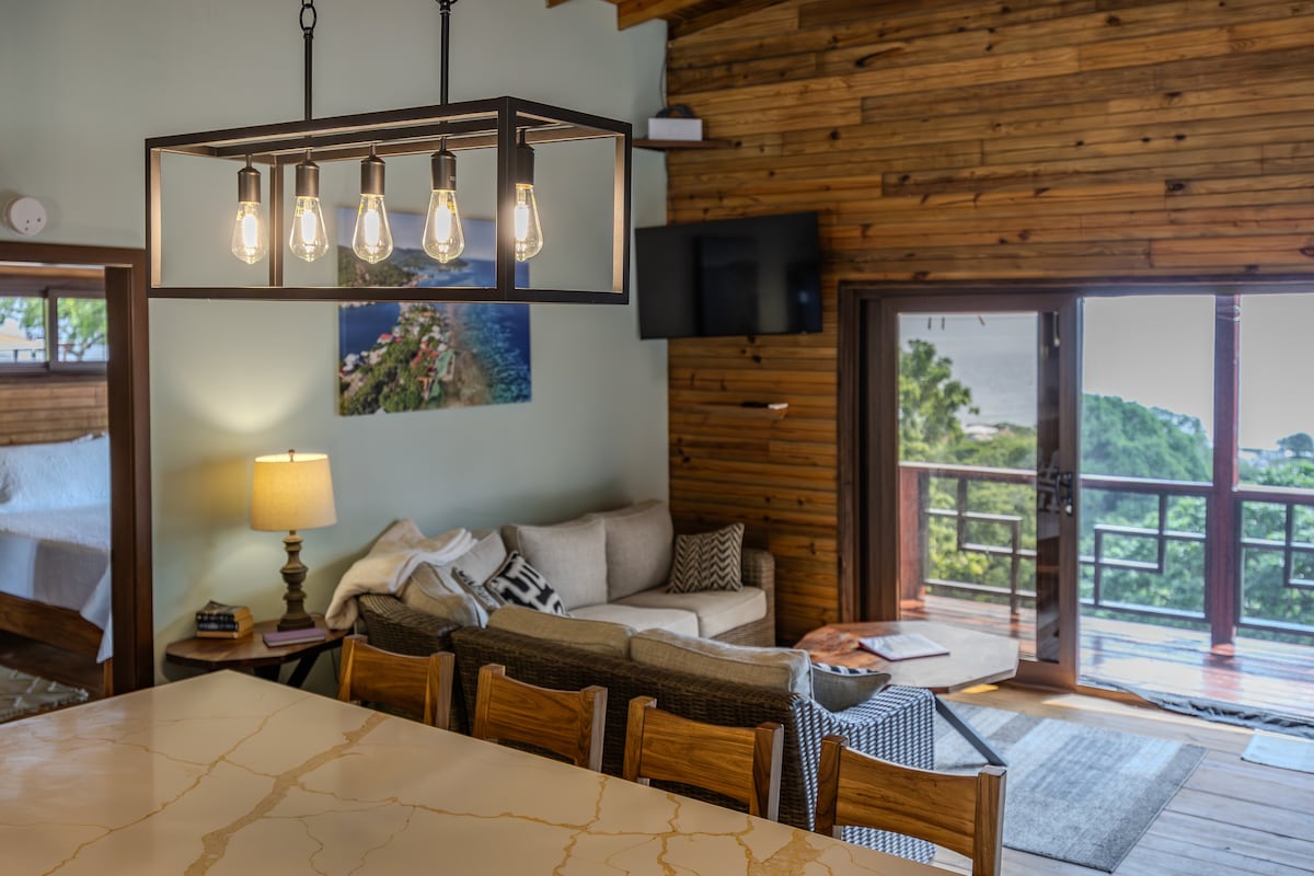 Step into a spacious haven where comfort meets sophistication, featuring air conditioning and ceiling fans that create a gentle, relaxing ambiance. High wooden ceilings add a touch of authentic island charm, enhancing the warm and inviting atmosphere. The outdoor deck offers a peaceful escape—perfect for enjoying your morning coffee while taking in breathtaking views that will leave you in awe. Every detail has been thoughtfully designed for your comfort and relaxation. Sit back and unwind.