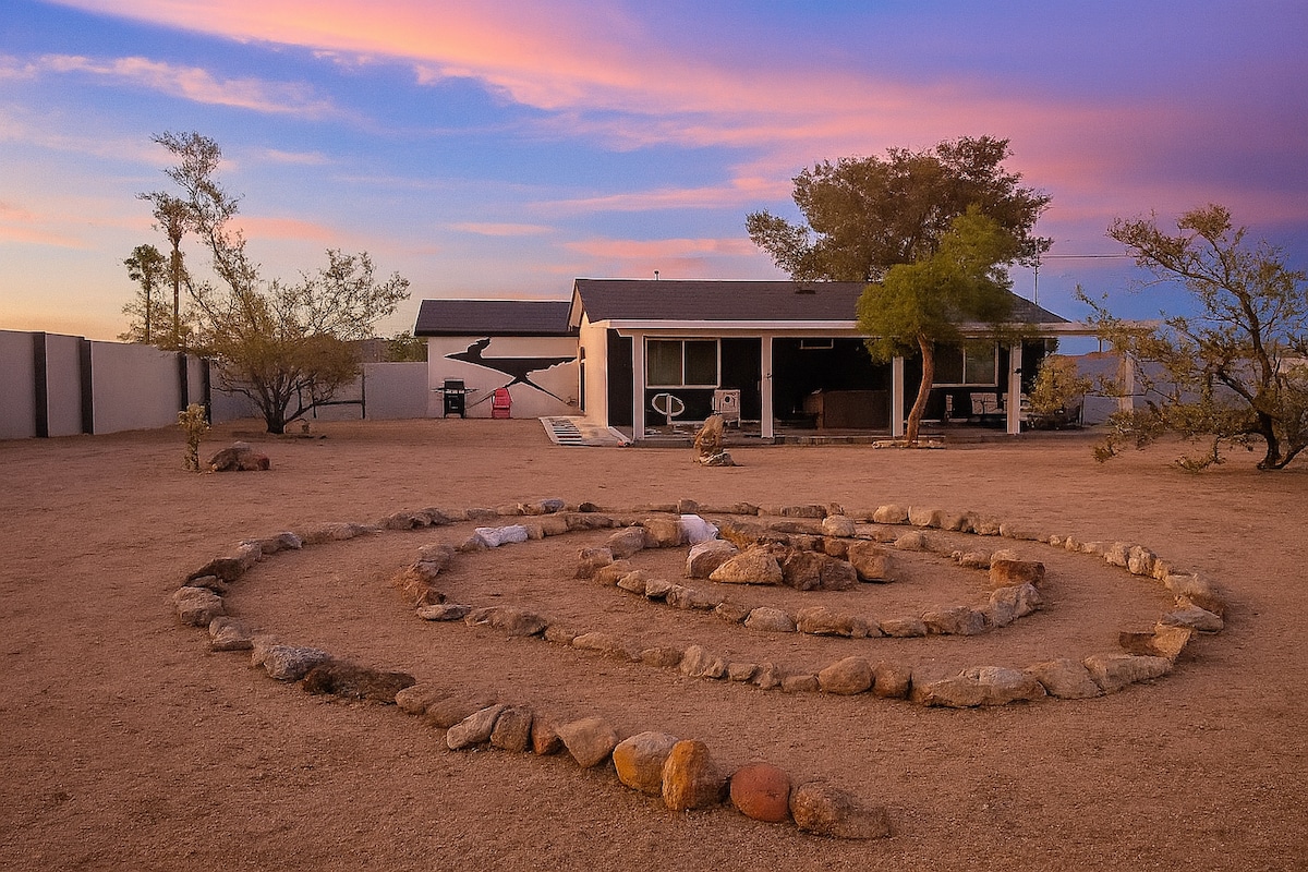 沉浸在這個僻靜的沙漠度假勝地的寧靜中,距離約書亞樹國家公園的新入口25分鐘。 這座改造過的1959年STUNNER坐落在5英畝的寧靜沙漠土地上,可欣賞沙漠、山脈和星星的壯麗景色。 2b/2b特大床房,配有獨立遊戲室/休息室。 在火坑旁舒適地享受,浸泡在熱水浴缸/泳池中,喝咖啡或在有遮蔭的露臺上喝雞尾酒。 帶上您的親人,準備放鬆身心,重新連接,享受沙漠生活方式。