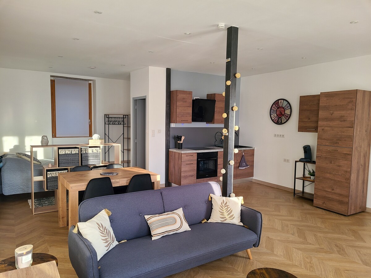 我們很樂意在我們50平方公尺的公寓接待您,坐落在裏昂和聖埃蒂安之間的小村莊的高處,坐落在裏昂山脈的中心。 距離 A89 高速公路 15 公里。 完全獨立,您可以將車停在公寓附近,在安全且封閉的庭院內。 距離不到500公尺內,您可以享用我們的餐廳、雜貨店/麵包店、煙草店。 星期三早上有小市場。 全新:披薩分配器