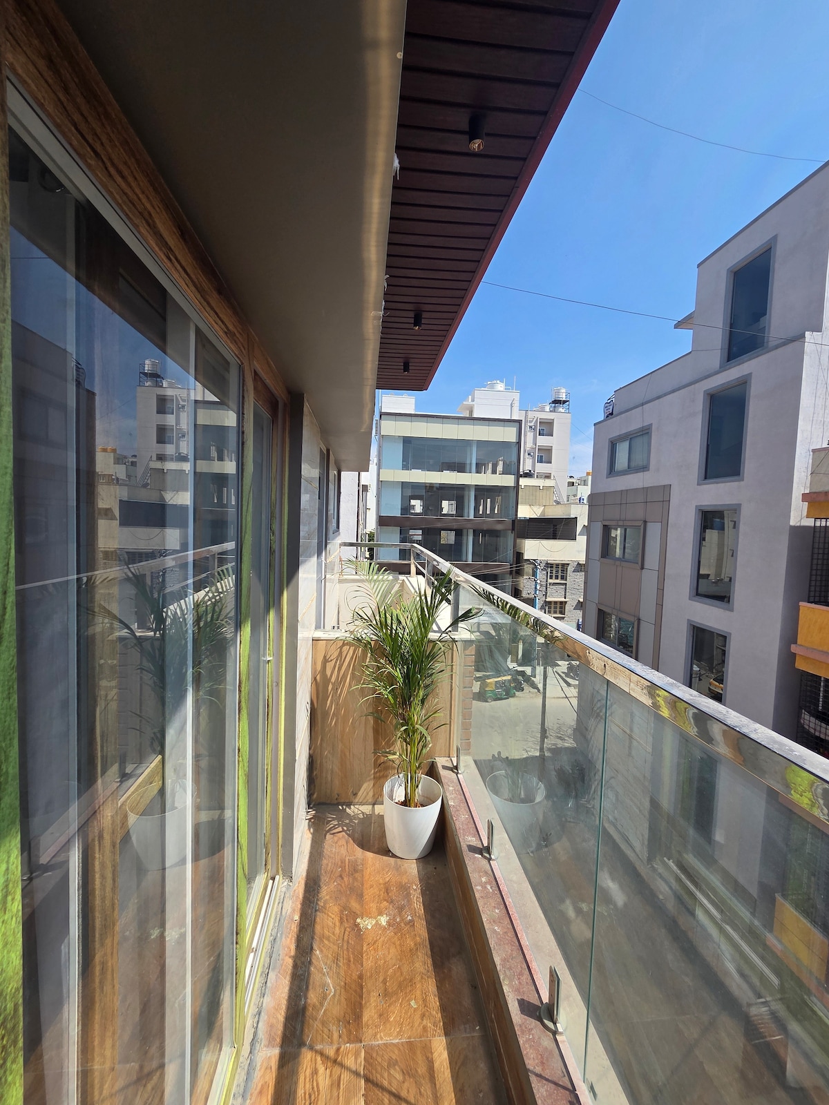 This is a luxurious & spacious penthouse situated in the center of Bangalore and it has 3 levels with plenty of private outdoor space. The greenery and the natural light coming from the skylight and huge glass windows are the highlights. The house is fully loaded with all the modern amenities required for a great stay. Daily housekeeping, 24/7 power, lift, car parking, modern kitchen, bar,desk space for work, high-speed internet, 65 inch TVs, JBL 5.1 soundbar are some of the standard amenities.