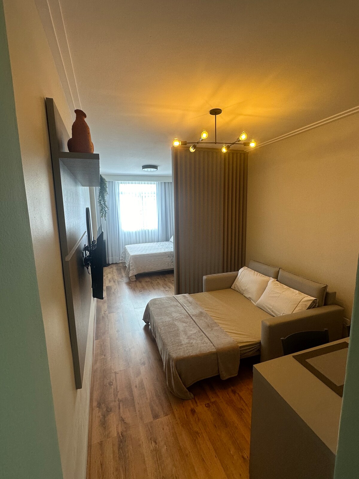 32平方公尺,設備齊全的單間公寓,配有空調、WiFi、洗衣機、乾衣機和智慧電視。 位於市中心最好、最現代化的915獨立建築內。 它提供一切舒適的設施:電梯、游泳池、健身中心、共同工作區和燒烤區。 靠近一切:市場、麵包店、酒吧、餐廳、健身房(Smart Fit)。 地理位置優越,方便前往這座城市的qlqr點。 公寓沒有車庫,大樓有輪流停車位,每天40雷亞爾。