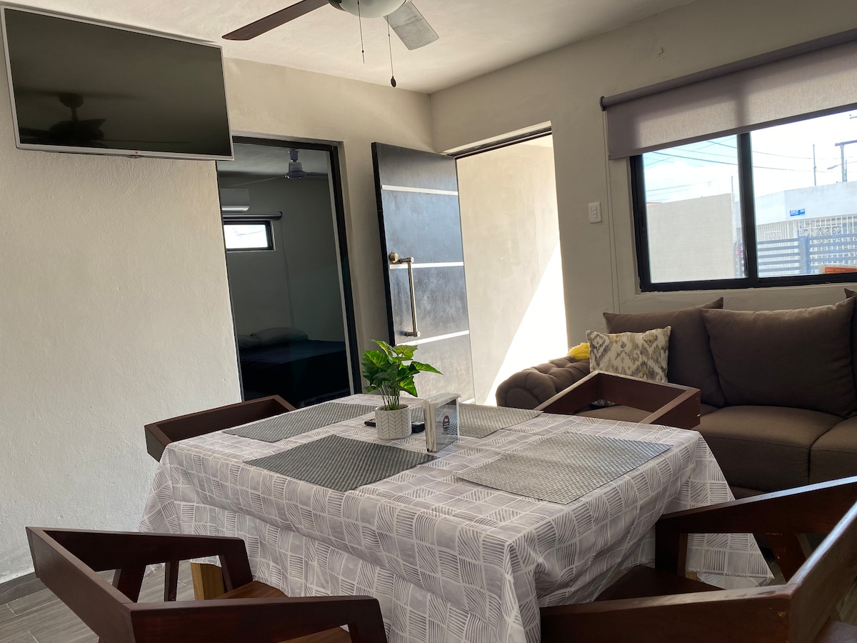 乾淨的公寓,適合兩位房客入住的安靜地方。配有電視、小廚房、迷你吧、微波爐、電鍋、咖啡機、餐具、玻璃杯。舒適寬敞的共用露臺。乘坐巴士前往主要大道 Paseo de Montejo 只需 20 分鐘,巴士從公寓 8 公尺外經過。 附近還有 OXXO 便利商店,步行 5 分鐘即可抵達,步行 10 分鐘即可抵達 Soriana 超市,乘坐巴士 15 分鐘即可抵達 Altabrisa 購物中心。