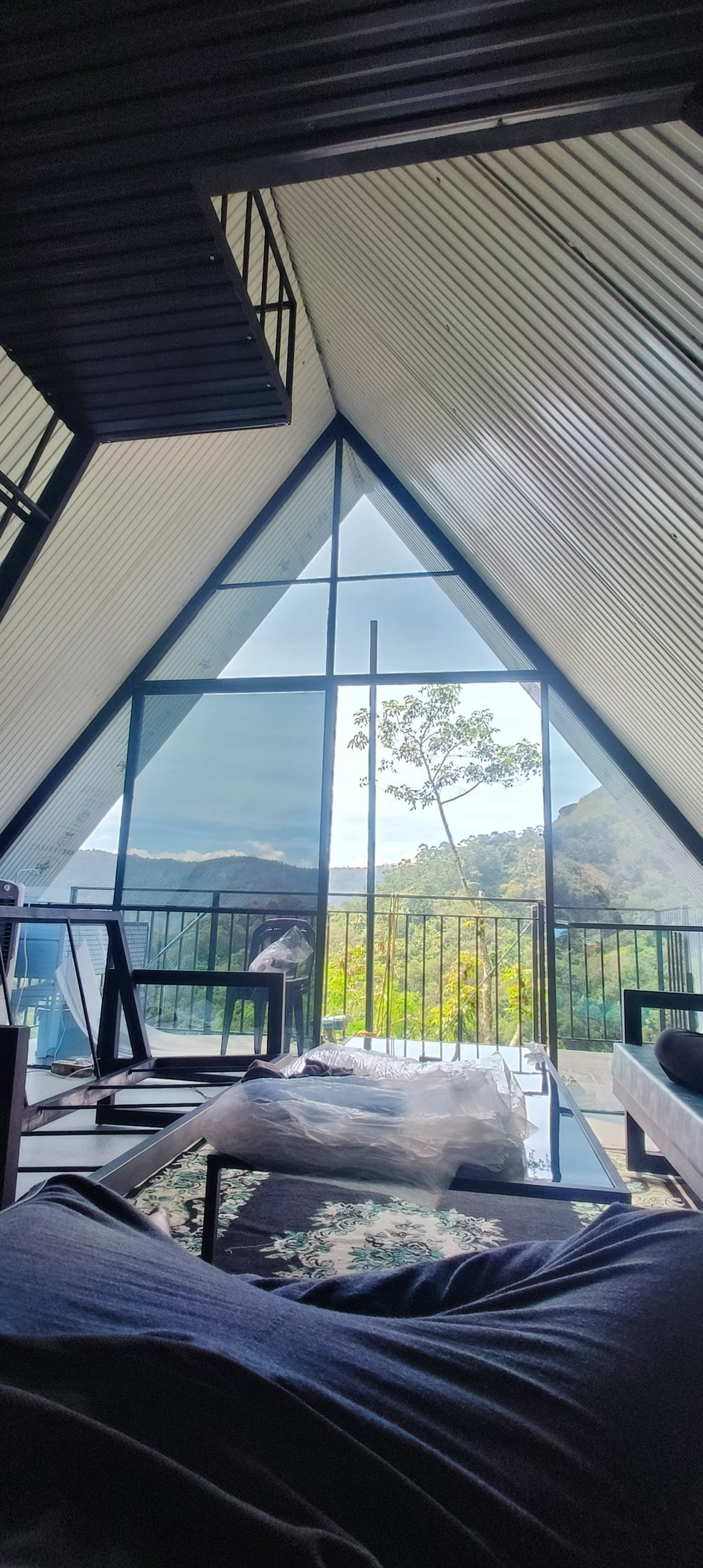 坐落在天然岩石的基礎上。這是一個三角屋(215平方英尺)結構和一個外部區域(100平方英尺)用於營火和燒烤。兩個甲板都與2公尺的橋相連,100公尺內唯一的橋,提供極高的隱私。房源使用太陽能,因此沒有停電問題。從公路到房源只有80公尺的短途步行,讓您感覺像在森林裡。