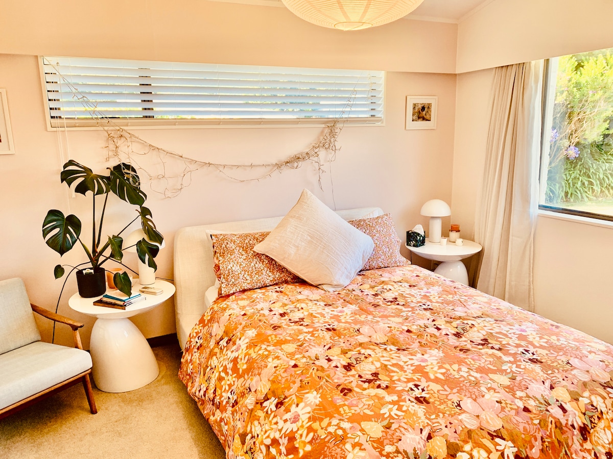 The Nest is a place you come to instantly switch off, relax and unwind. Thoughtfully decorated to feel warm & inviting, there are many eclectic pieces that the owner has collected whilst travelling and living overseas, which add a touch of wanderlust. It's the little details like high quality bedlinen and fluffy white towels that help set this local spot apart. Enjoy total privacy both indoors & the self-contained outdoor area complete with a fire pit. The local Tui's can provide the tunes.