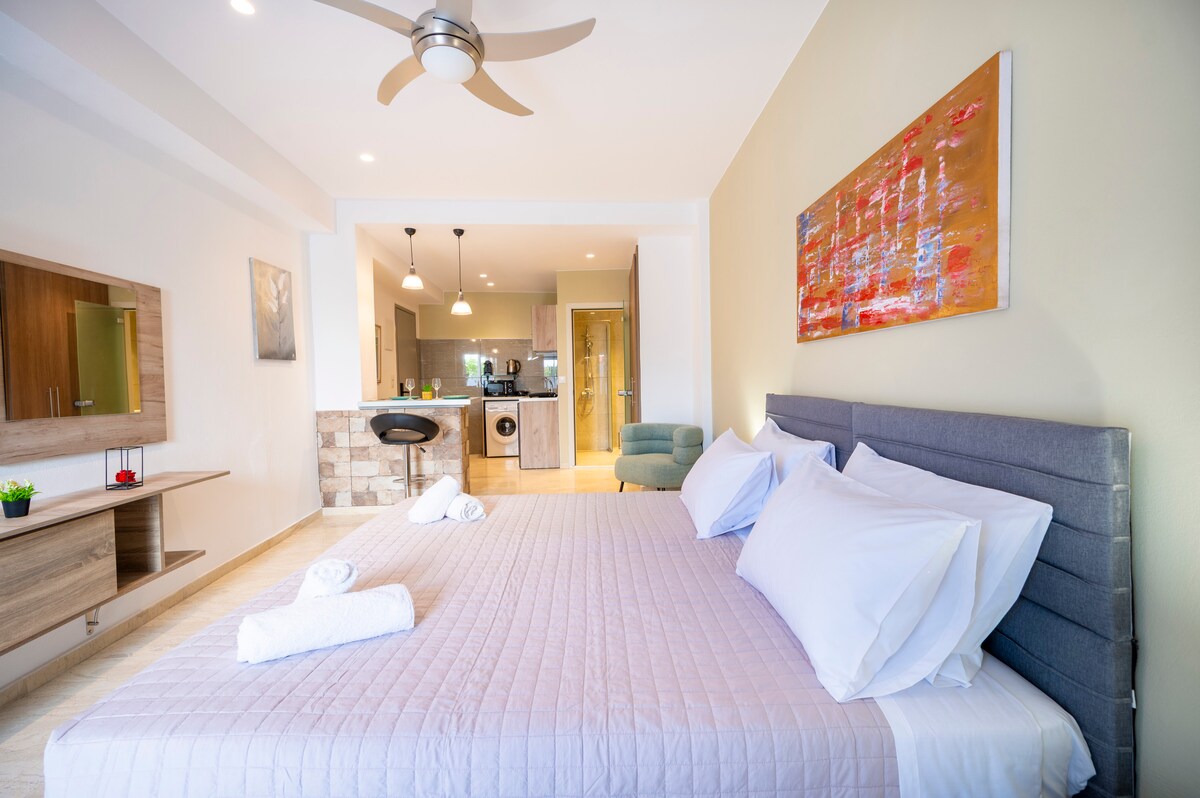 Our renovated for 2024 well-appointed studio about 35m2(2nd floor), offers fully equiped kitchen, air condition,flat screen TV,wifi, bathroom with spacious shower and large balcony. Because of our central location you can explore all Kardamena village by foot! We are about 80m from Kardamena's bus station, taxi station and the biggest super market. Kardamena's coastal road, central beach and barstreet is about 200m far away.