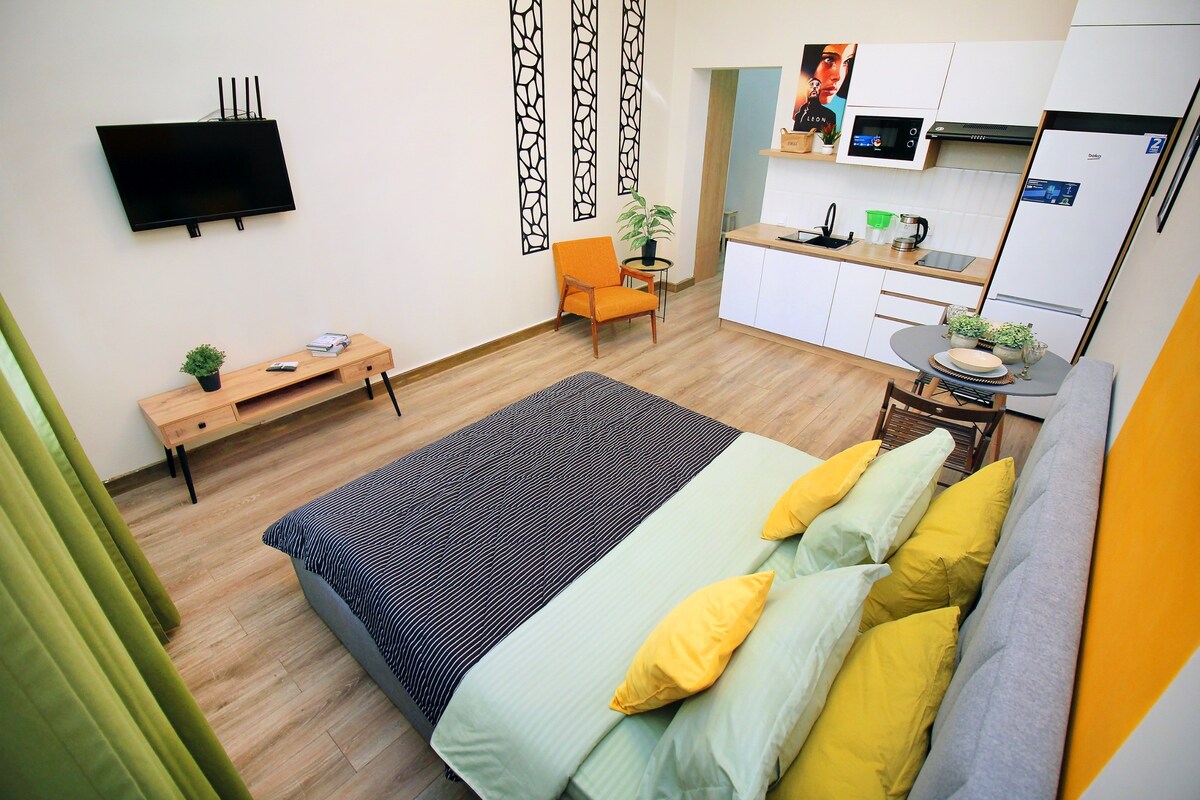 Уютная квартира-студия в современном жилом комплексе в центре города. С 13-го этажа открывается прекрасный вид на горы и город. Идеальный вариант для одного-двух гостей, которые ценят комфорт и удобное расположение! Cozy studio flat in a modern apartment complex in the city centre. The 13th-floor location offers a beautiful view of the mountains and city. A great choice for 1-2 guests who appreciate comfort and a convenient location!