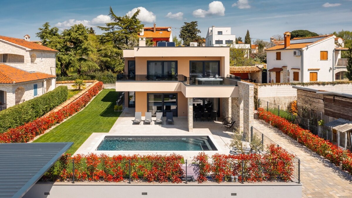 在波雷奇( Poreč )附近,您可以找到獨立的陽光別墅,配有遊泳池和海景。 Villa SUN於2025年竣工,配有義大利設計師家具,分為兩層。 特別亮點是泳池旁的燒烤廚房。 客廳用餐區邀請您度過美好的夜晚。 在舒適的臥室中,您可以睡個好覺,醒來時欣賞海景。 大型圍欄花園,可供兒童和狗狗玩耍。 院子裡有汽車充電站。