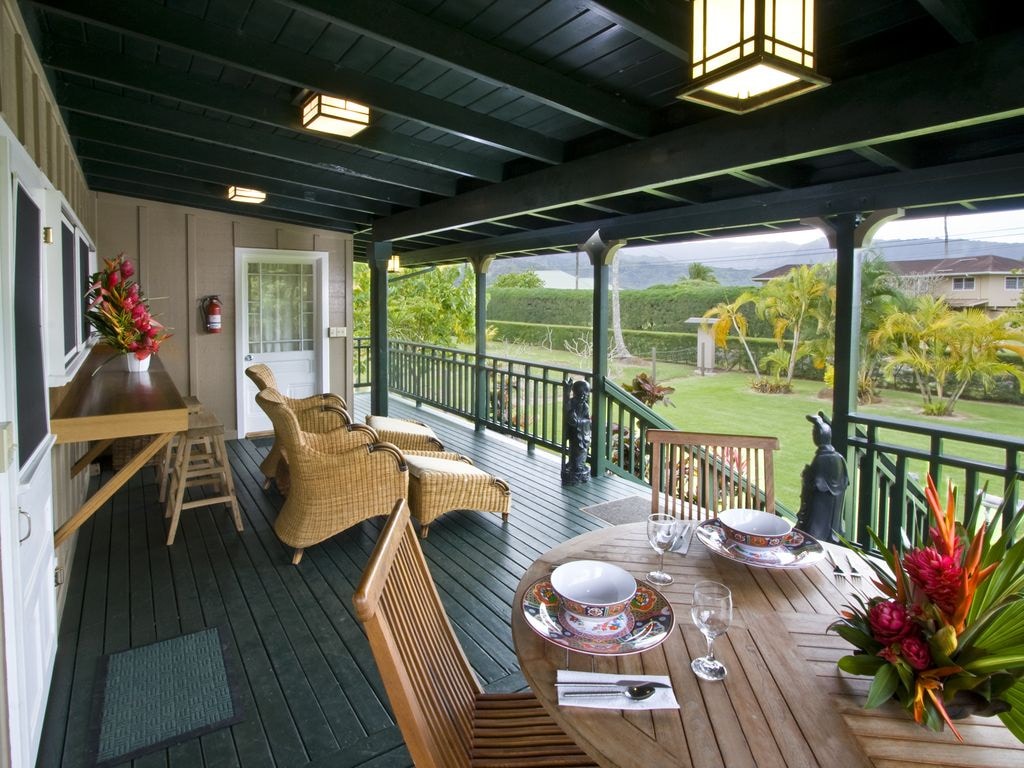 This air-conditioned cottage is a traditional plantation-style Hanalei home. Every detail evokes the spirit of Old Hawai'i—open beam ceilings, natural wood finishes, and breezy lanais that invite the outdoors in.