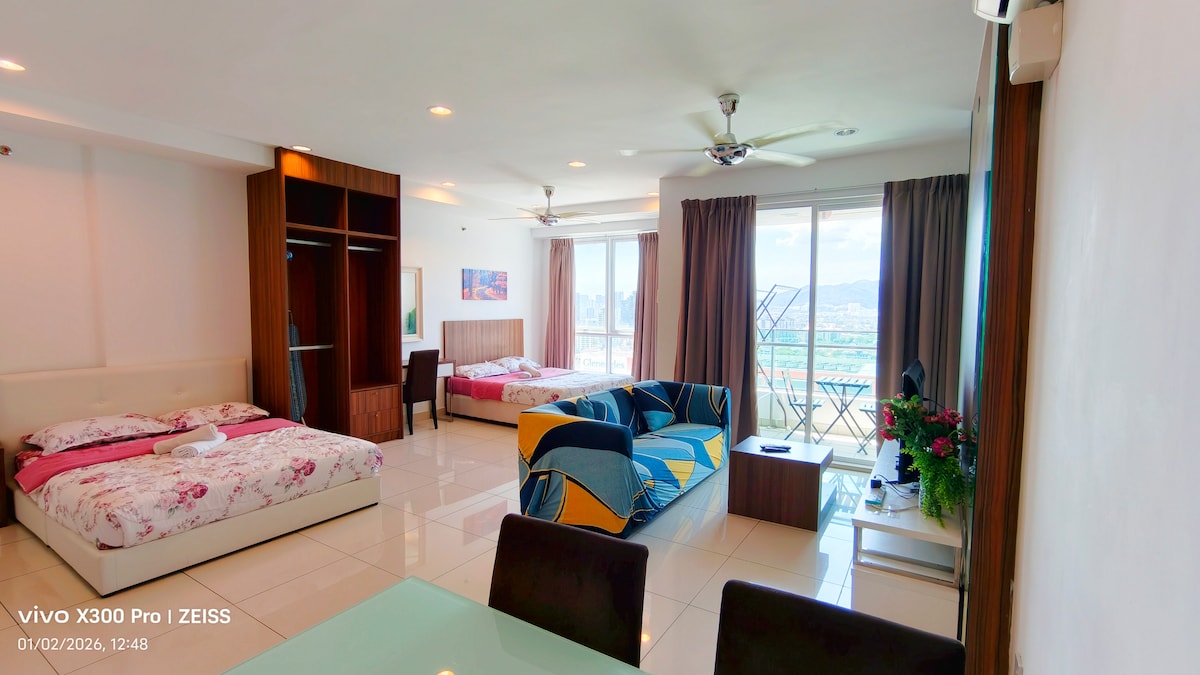 我們全新的舒適套房坐落在槟城市中心,前往當地旅遊景點很方便。日式/韓式餐廳和7-11便利商店就在我們的房源下方!步行5分鐘即可抵達當地美食、肯德基和必勝客! 我們提供 •優質的待客服務 •日出和城市景觀 • PS3娛樂和Netflix • 1 個私人停車位 • 100 Mbps WiFi • 無邊泳池景觀 •全屋空調 如果您喜歡這個繁忙城市中安靜舒適的地方,不要等待,立即預訂!!!