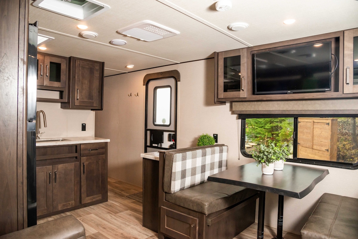 在這個難忘的度假勝地,與大自然重新建立聯繫。 這個露營車/露營車有1間配有滑動門的1.8公尺寬雙人牀臥室、2張上下鋪、充足的儲物空間以及廚房桌子、沙發和浴室。 享受新建的露臺,以及供家庭使用的野餐桌。 包括燒烤和現場火坑。前往肯諾拉市中心很方便,距離Longbow湖的海灘幾分鐘路程,靠近Rushing River Provincial Park (有海灘)。3分鐘即可抵達公共船隻發射。