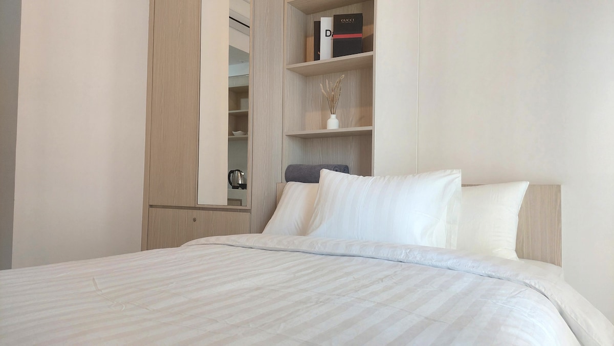 Unit 2 bedroom menggunakan Springbed size King untuk kamar utama, dan kasur size junior untuk kamar kedua, terdapat tambahan kasur extrabed yang dapat digunakan secara gratis. Tersedia peralatan mandi handuk, sabun dan sikat gigi terdapat juga peralatan memasak yang bisa anda gunakan di unit kami.