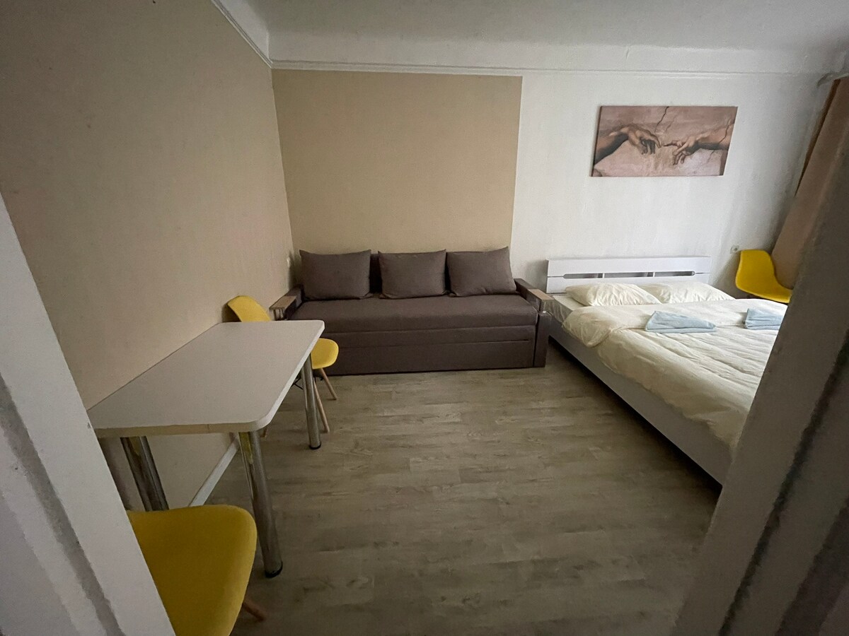 歡迎來到這間豪華迷你單間公寓,2021年在基輔市中心新裝修。大床和床墊(160x200)由主要酒店經營者的供應商定制設計。公寓的窗戶有三層玻璃,所以儘管在市中心,公寓非常安靜。廚房設備齊全。洗衣機可供您使用,並提供洗衣精。現代化的乾淨淋浴間配有液體洗髮精/沐浴露。14: 00後輕鬆自助入住。