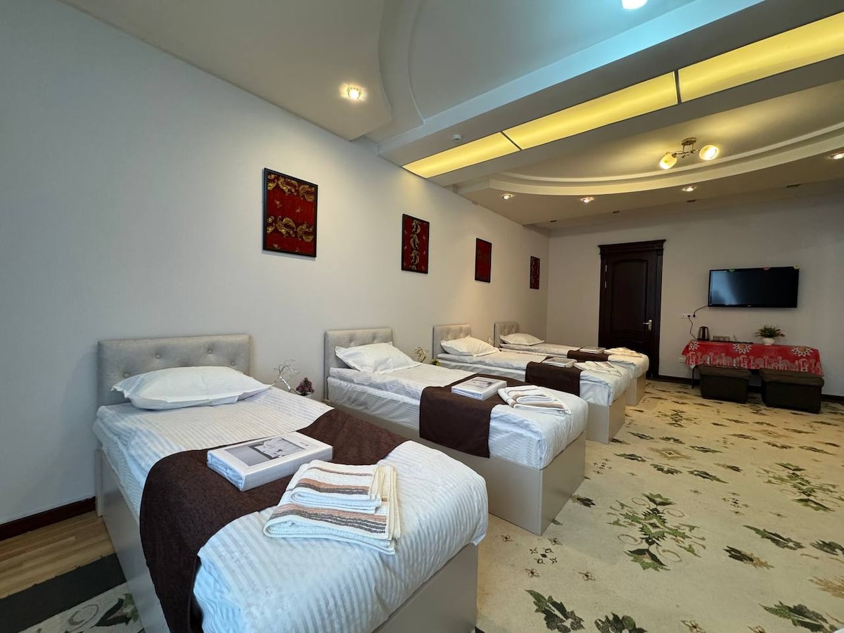 Комфортный 6-местный номер для семьи или компании туристов. Идеален для совместного отдыха — много пространства, удобные кровати и всё необходимое для проживания.