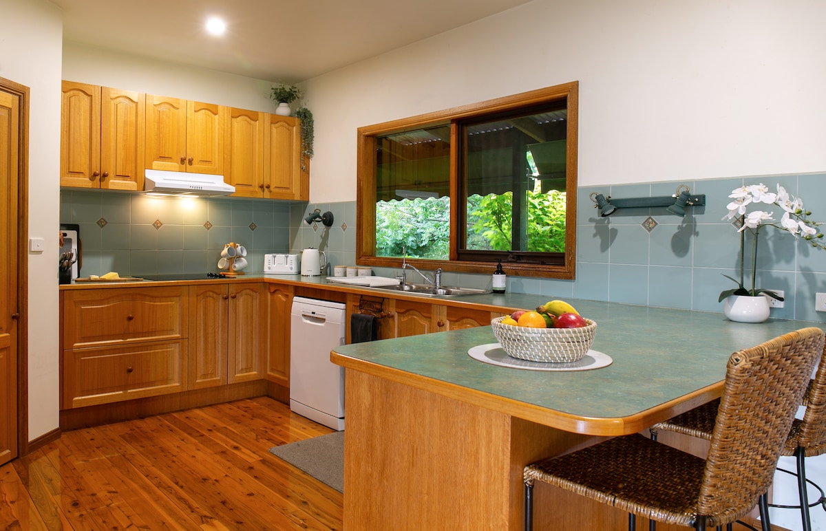 "Tanglewood Cottage" features mud brick walls, a reverse cycle air-conditioner, modern self-contained kitchen with stone bench tops. Bathroom features vanity cabinet with a stone bench top. shower and a front loading washing machine. Comfortable lounge with leather couches & efficient wood fire. Beautiful garden of diverse trees leads to a large olive grove, and paddocks with sheep and cattle. Fresh baked bread, home made jam & marmalade,