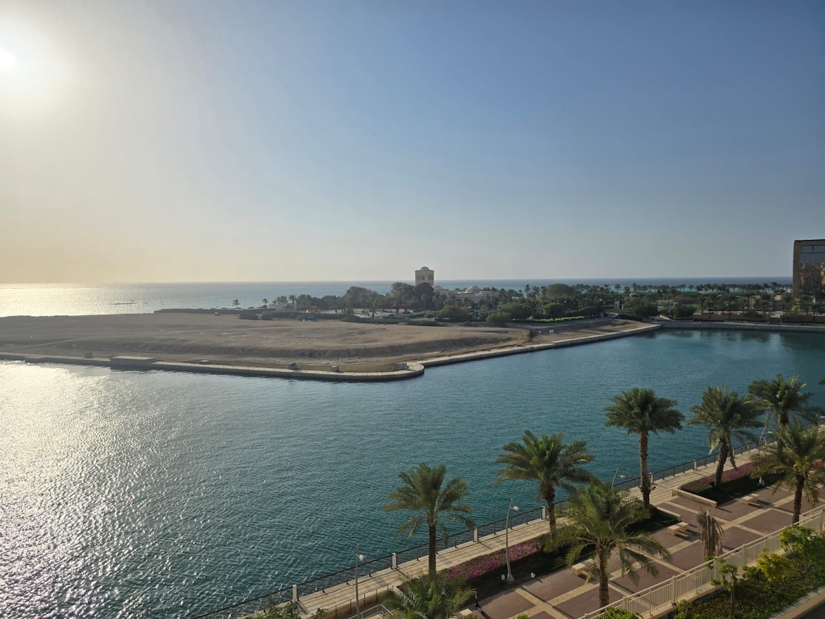 Newly furnished beach-themed apartment overlooking the ocean in the heart of KAEC city. We are right above the beachfront walk with lots of activities and restaurants nearby. Our location is a prime spot and you are bound to have a good time!