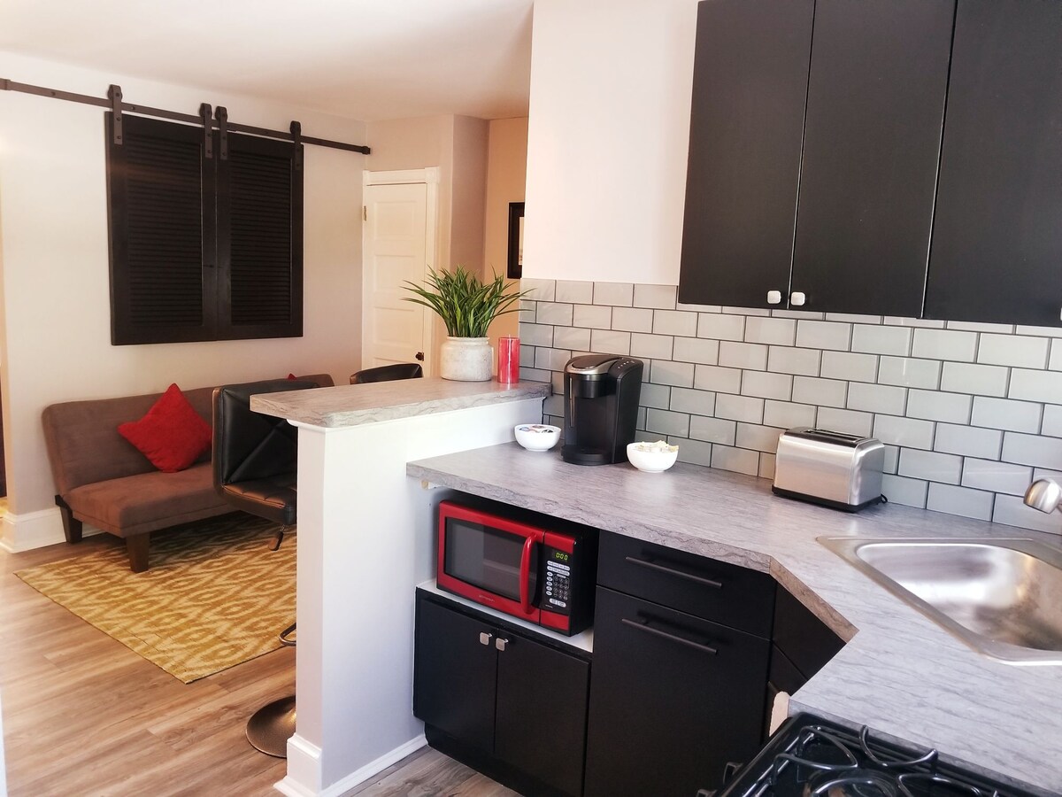 1000平方英尺的一樓單位,位於市中心的2單位豪華連棟房屋。由於這是我以前的家,我設計它時考慮到我的舒適和品位。但不要相信我的話:看看評價! 兩個免費停車位。 驚喜包括:通過暗門的秘密「地下酒吧」休息室、巨大的廚房、強大的空調、單元內洗衣機/烘乾機、高端音響系統、三臺電視,配備高級有線電視、Roku和Netflix、雨淋式淋浴間、高級肥皂和餐具、Tempurpedic床、Keurig拿鐵機。